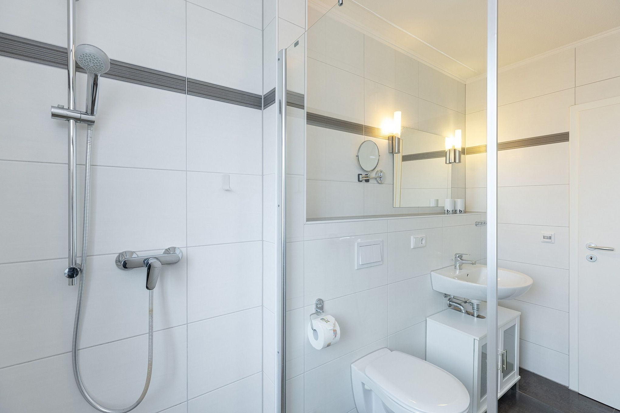 Modernes, hell gefliestes, barrierefreies Tageslichtbad mit Dusche, WC und Waschbecken. Das Bad verfügt über eine Fußbodenheizung.