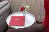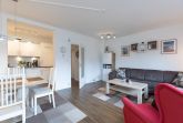 Modern ausgestattetes Wohn- und Esszimmer mit direktem Zugang zur Terrasse. Das Wohn- und Esszimmer ist mit einer Schlafcouch (Liegefläche 120 x 240cm), einem Couchtisch, einem Essplatz für 4 Personen und einem Wohnzimmerschrank ausgestattet. Zur Unterhaltung stehen ein Flachbildschirm, ein DVD-Player und eine Mini-Stereoanlage zur Verfügung. Das Zimmer ist gefliest, das Fenster lässt sich durch ein Innenrollo und einen Vorhang etwas verdunkeln.