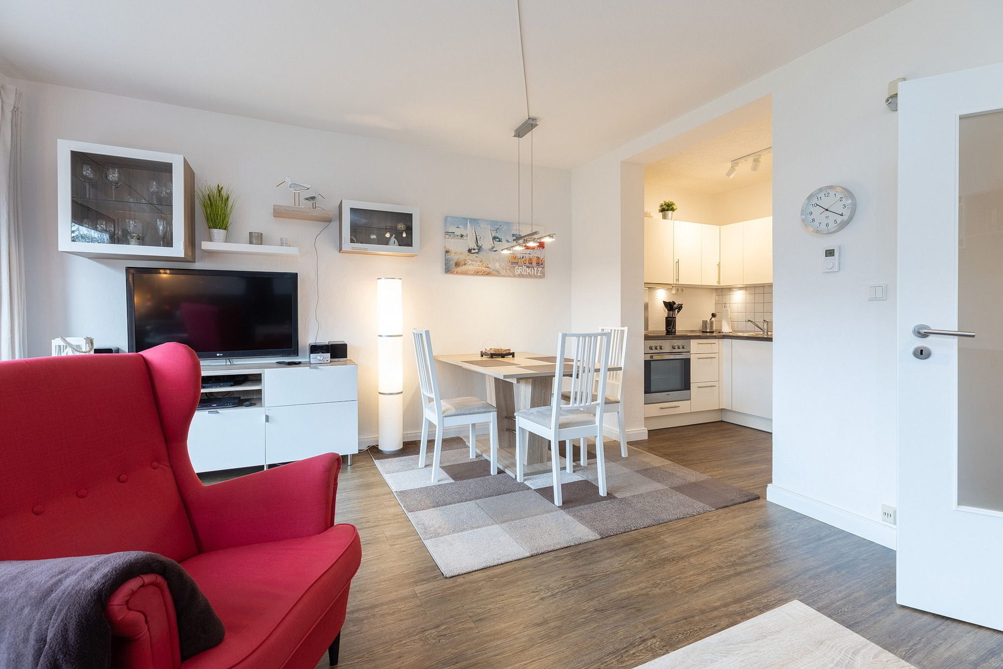 Die EG-Wohnung befindet sich in ruhiger Lage in einem gepflegten Reihenmittelhaus nur wenige Gehminuten vom Strand und dem nächsten Supermarkt entfernt.