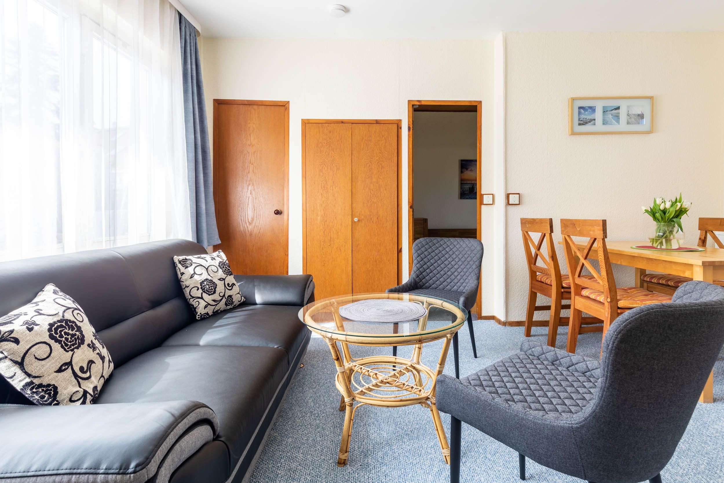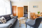 Der Wohn- und Essbereich verfügt über ein Sofa mit passenden Sesseln, Sat-TV und einer Essecke für 4 Gäste. Weiterhin gibt es im Wohnzimmer einen Wandschrank, wo Sie Ihre Urlaubsgarderobe unterbringen können.