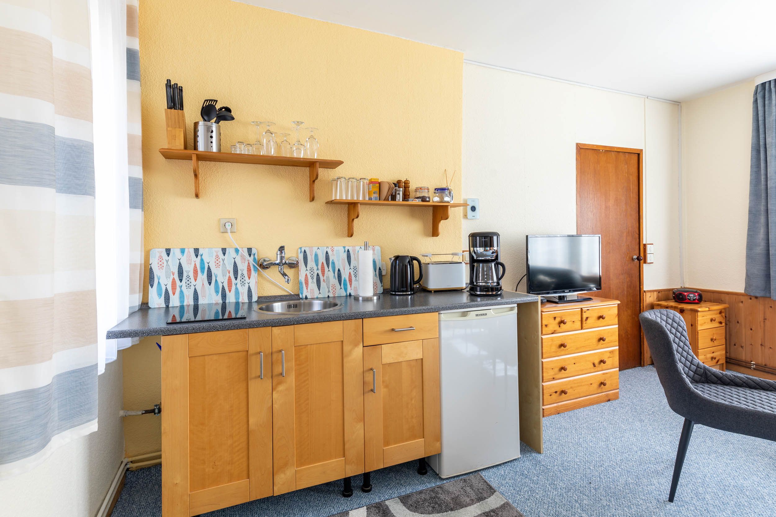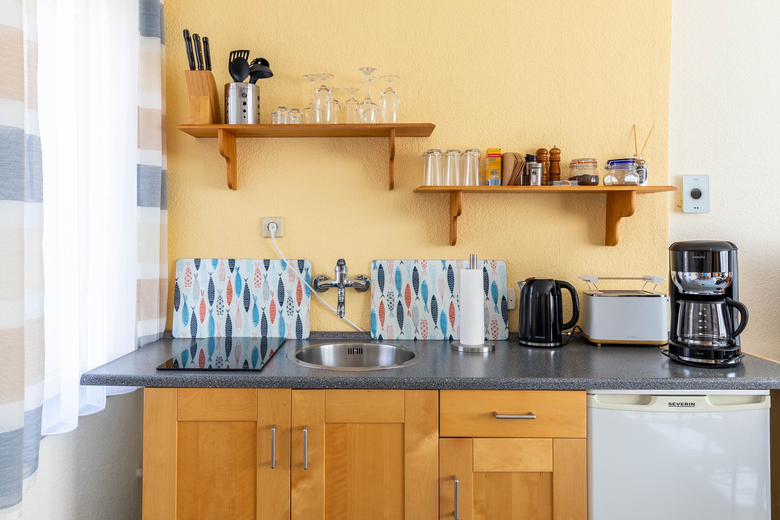 Die offene Küchenzeile ist mit einem 2 Plattenherd, Kaffeemaschine, Toaster und einem Kühlschrank ausgestattet.