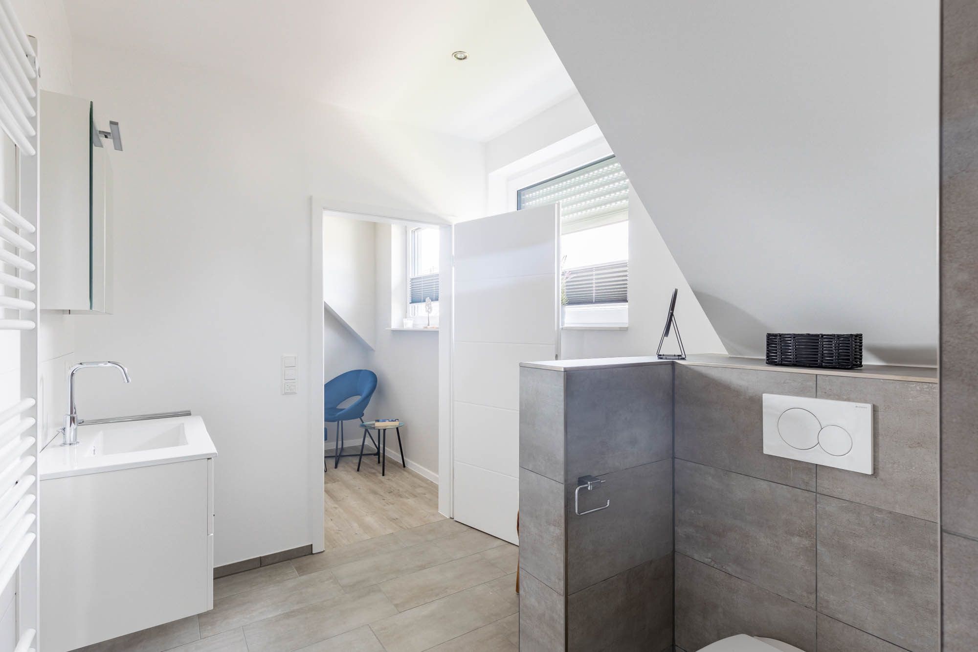 Auf dieser Wohnebene finden Sie ein zweites modernes Bad, welches ebenfalls mit bodengleicher Dusche, WC und Fenster ausgestattet ist.