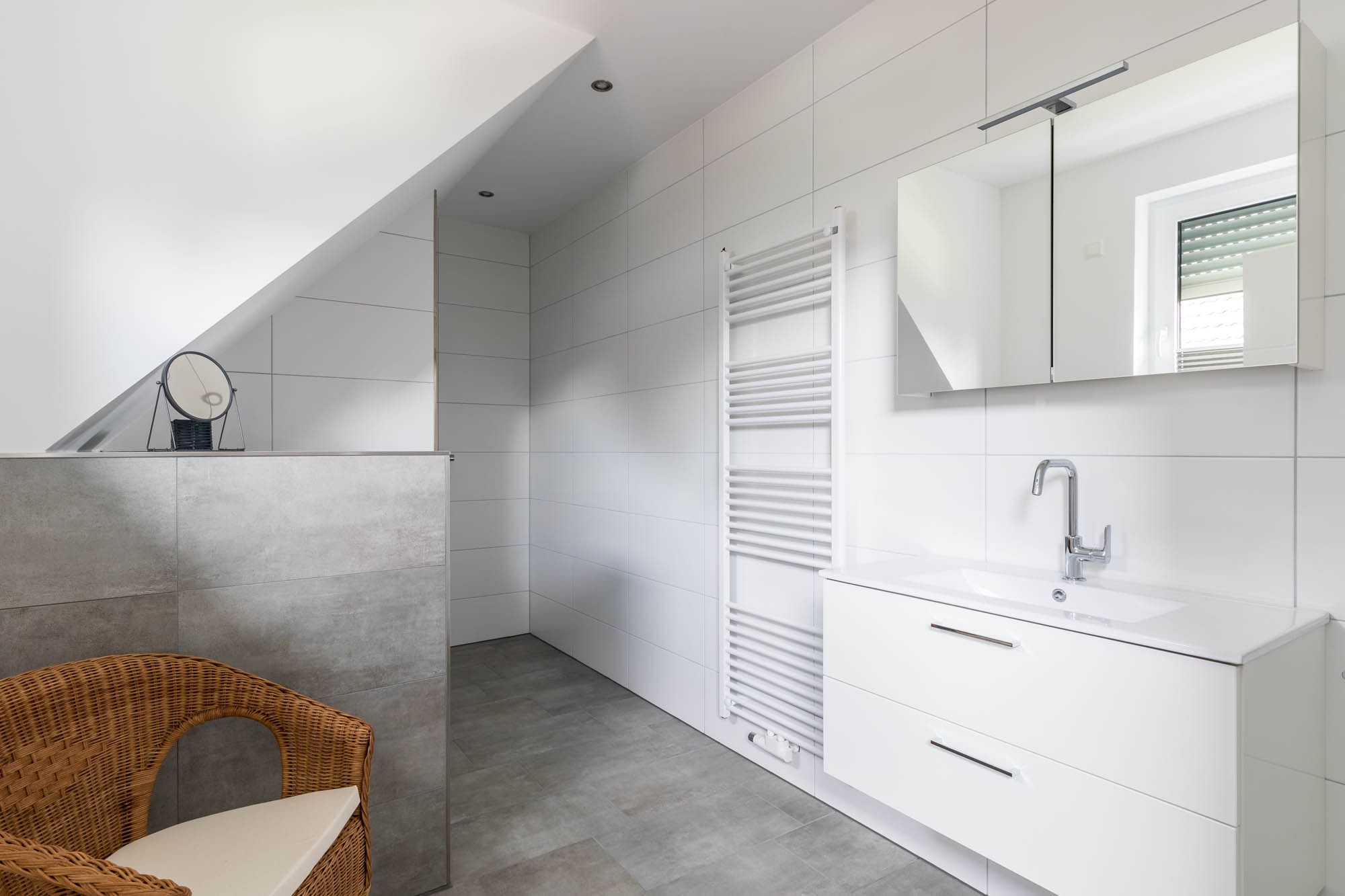 Weiterhin befindet sich auf dieser Ebene ein modernes Bad mit bodengleicher Dusche und WC. Das Fenster sorgt außerdem für ausreichend Tageslicht und hilft beim Lüften nach dem Duschen.