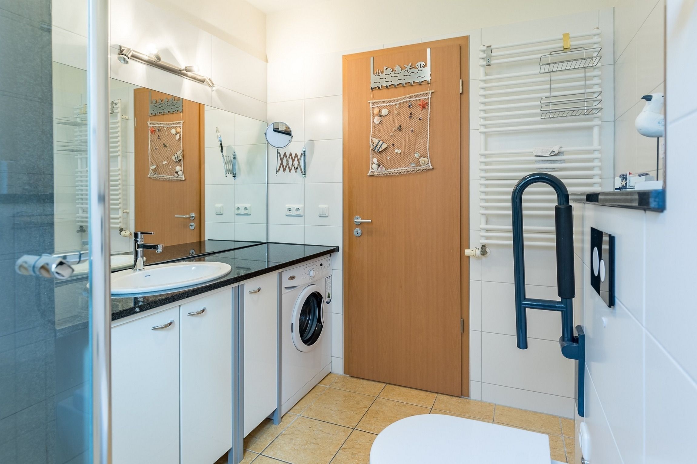 Im Badezimmer beeindruckten der große Spiegel, die Waschmaschine und die Fußbodenheizung. Es gibt eine Dusche und einen großzügigen Waschtisch.