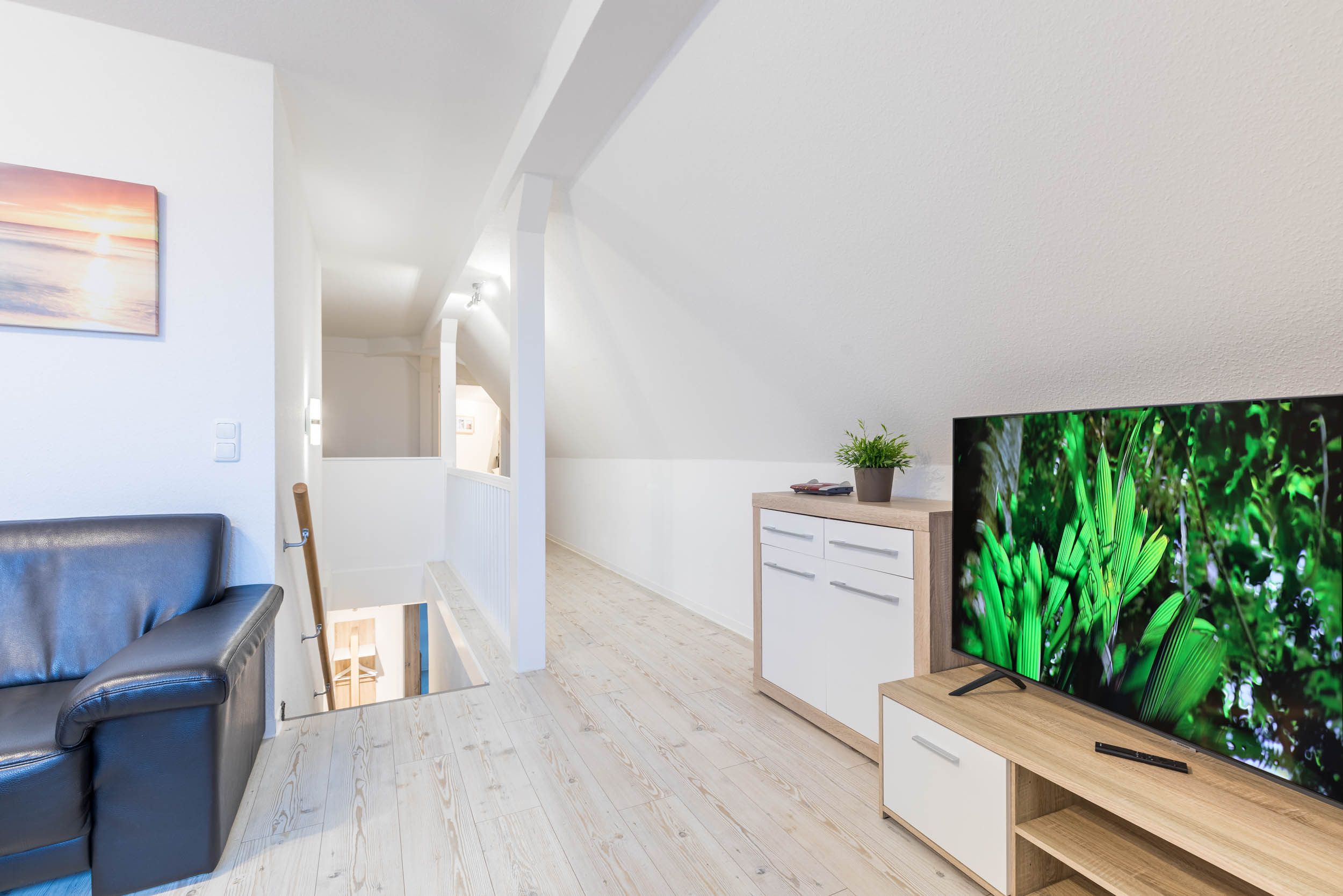 Auf der zweiten Wohnebene (im DG) befindet sich das separate, helle und geräumige Wohnzimmer mit Blick in die südliche Weidenlandschaft. Es bietet viel Platz zum Entspannen und Genießen. Hier ist ein großer SAT-TV (55 Zoll Smart TV LCD) vorhanden und durch die gemütliche Sitzgarnitur perfekt für einen Filmabend geeignet. Und Sie gelangen von hier direkt auf den möblierten Südbalkon, von dem Sie wunderbar die Mittagssonne oder die Sonnenuntergänge in der Weidenlandschaft genießen können.