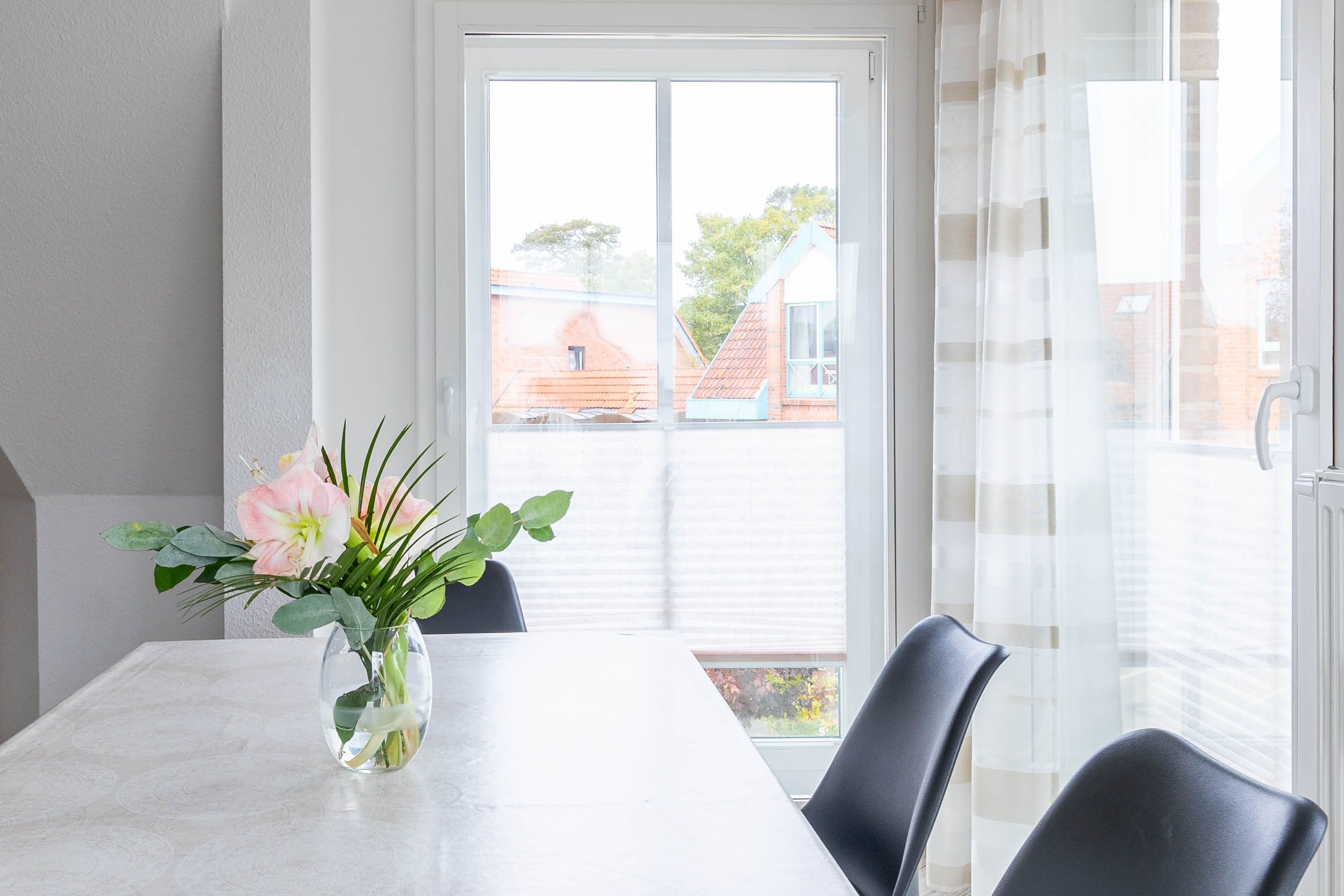 Ein gemütliches Esszimmer bietet neben dem großen Esstisch auch eine wunderbare Aussicht auf die Cafés und Restaurants im Zentrum sowie eine gemütliche Sitzecke mit SAT-TV (43 Zoll Smart TV LCD).