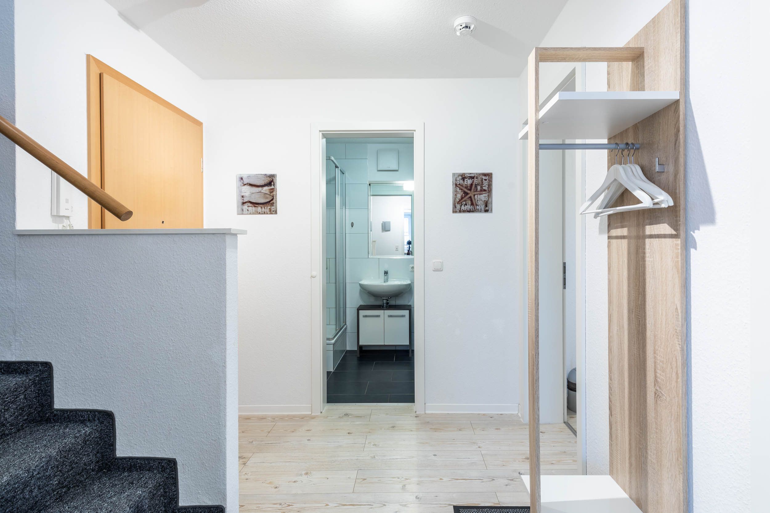 Im modernen Badezimmer befindet sich eine Duschkabine, Waschbecken sowie Föhn und eine Handtuchheizung.