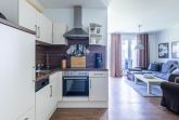 In der zum Wohnbereich offen gestalteten Küchenzeile finden Sie alles Mögliche, was Sie für eine Selbstverpflegung benötigen. Von Backofen, Herd, Geschirrspüler über Kühlschrank mit Gefrierfach, Töpfe, Pfannen und auch Elektrokleingeräte ist alles dabei. An der separaten Essecke können Sie bequem Ihre Mahlzeiten einnehmen.