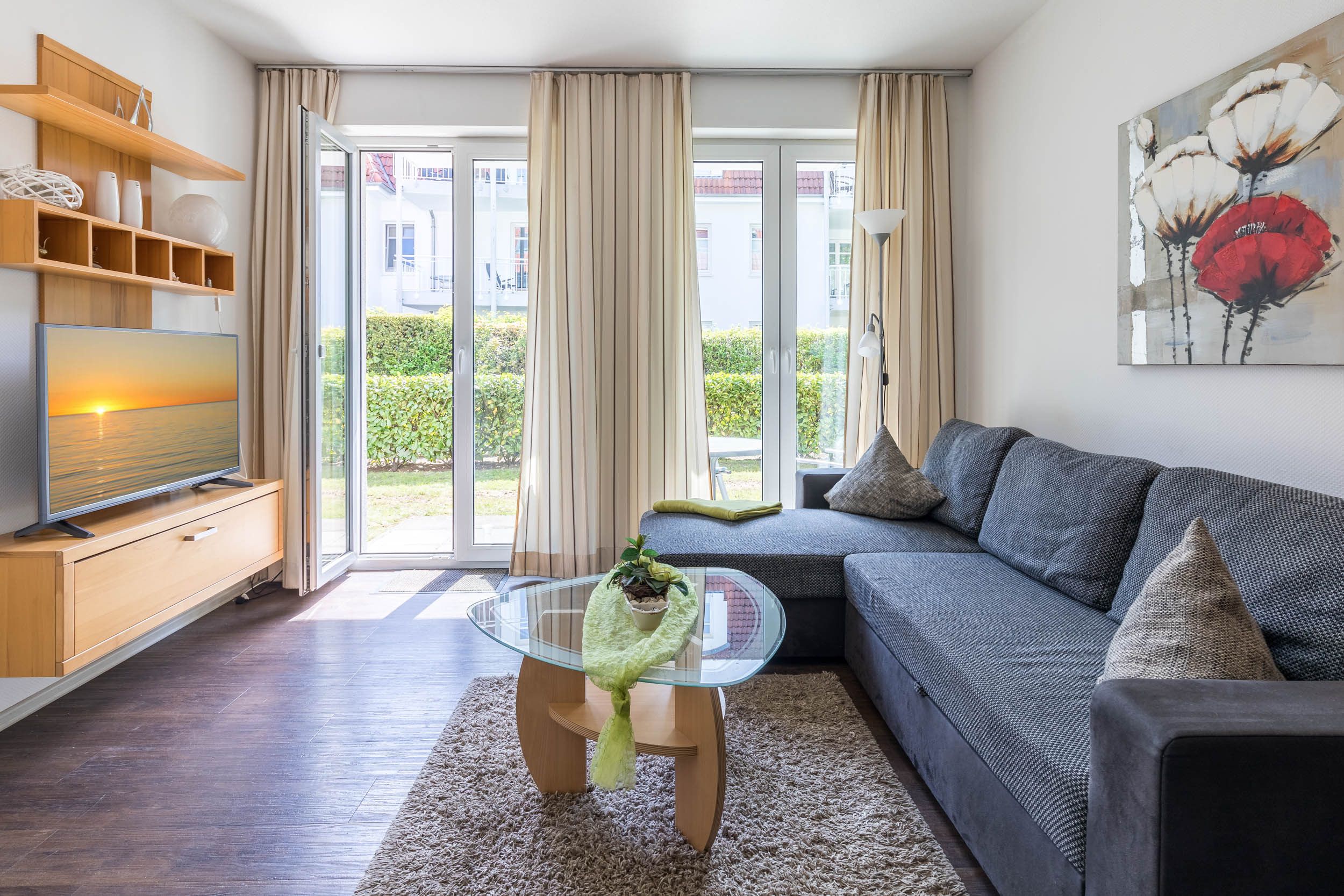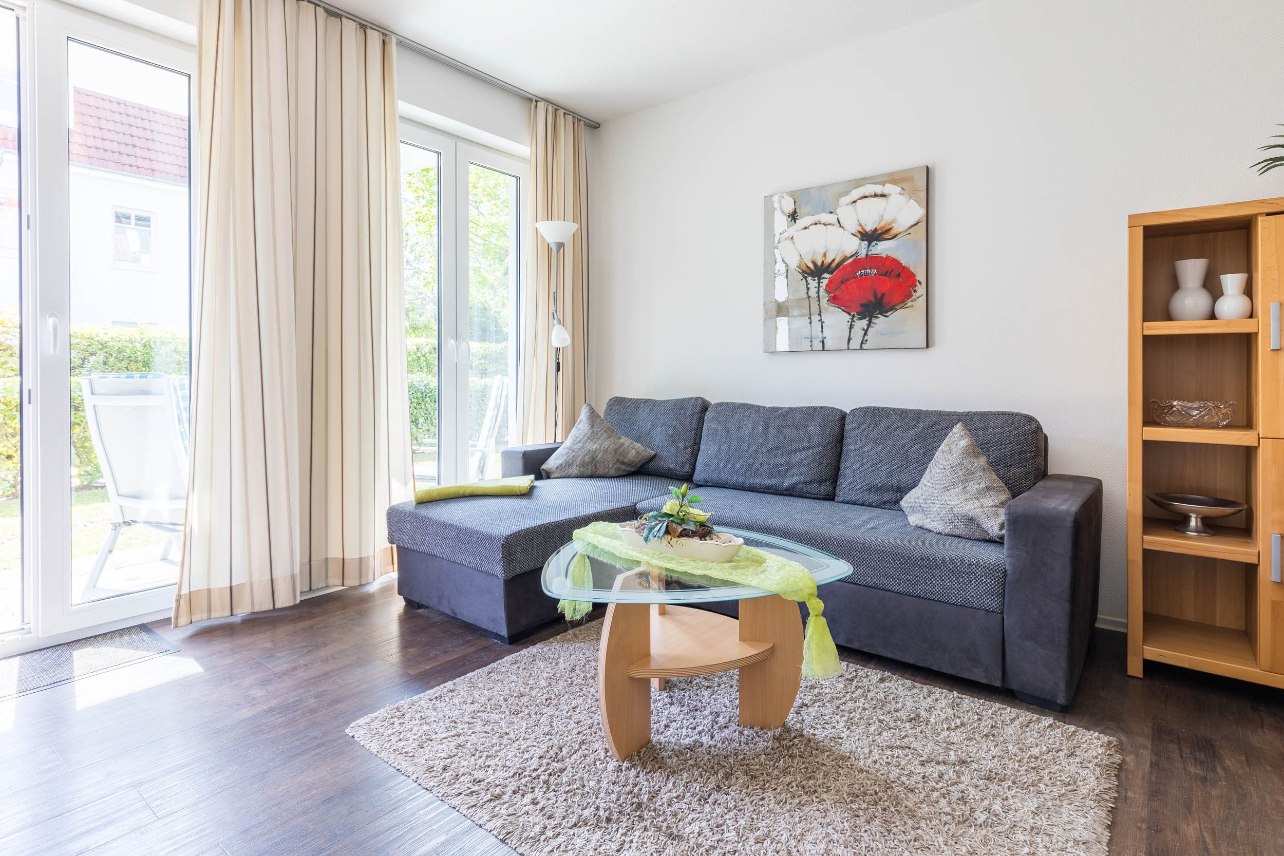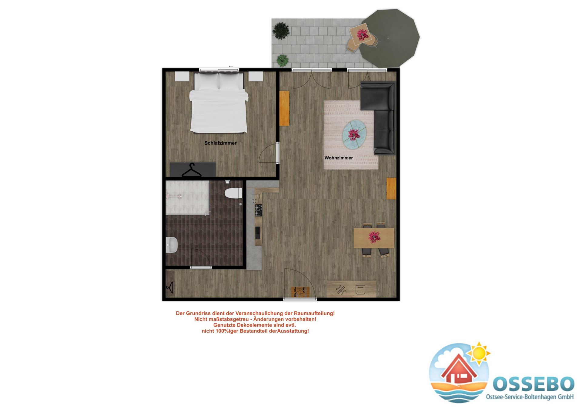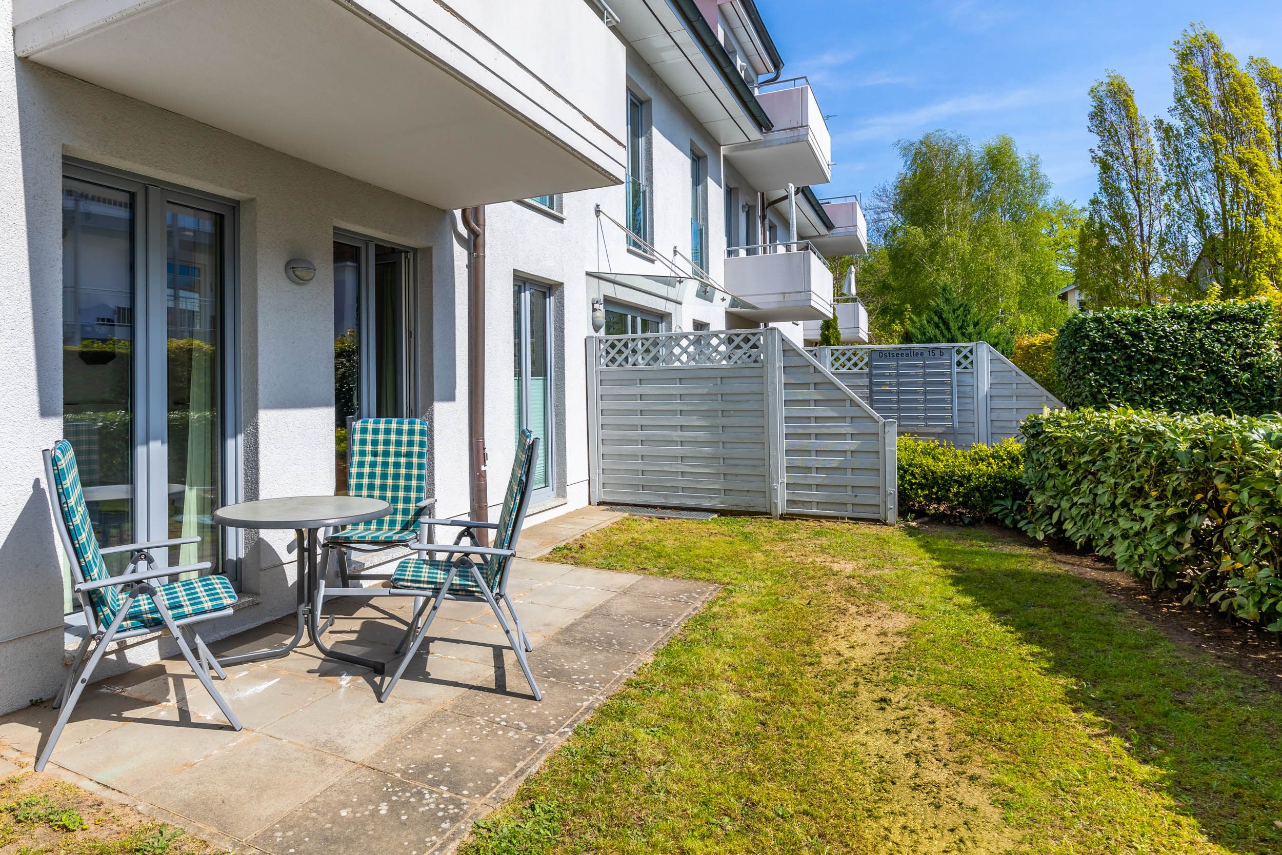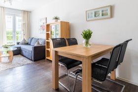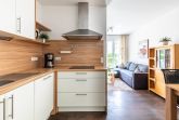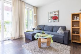 Das 45 Quadratmeter große 2-Zimmer-Apartment im Erdgeschoss mit Terrasse eignet sich für bis zu 3 Personen.