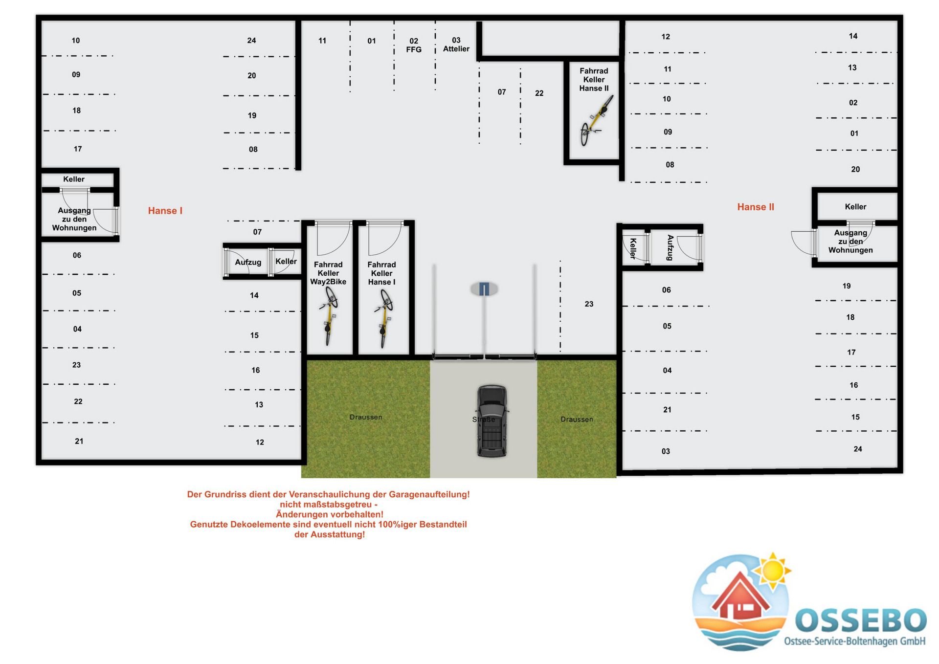 In der Tiefgarage befinden sich für Haus I und Haus II jeweils ein allgemeiner Fahrradkeller (begrenzter Platz). Hier können Sie Ihre geliehenen oder mitgebrachten Fahrräder & Co. unterbringen.