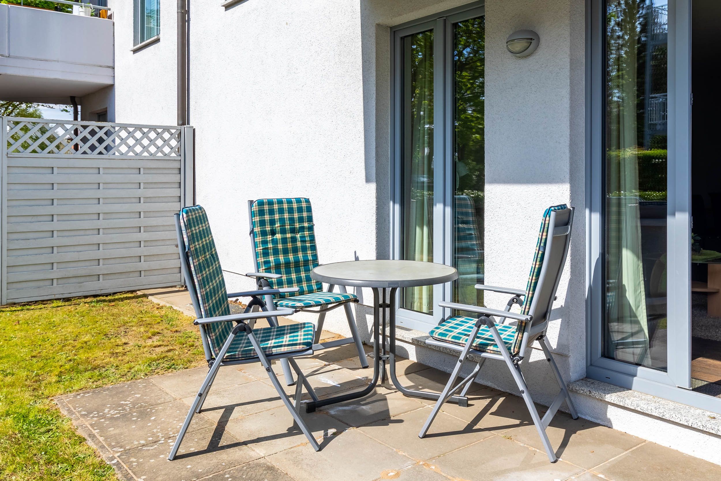 Vom Wohnzimmer kommen Sie auf die mit Gartenmöbeln ausgestattete Terrasse, auf der Sie unter anderem Rauchen und Grillen können.