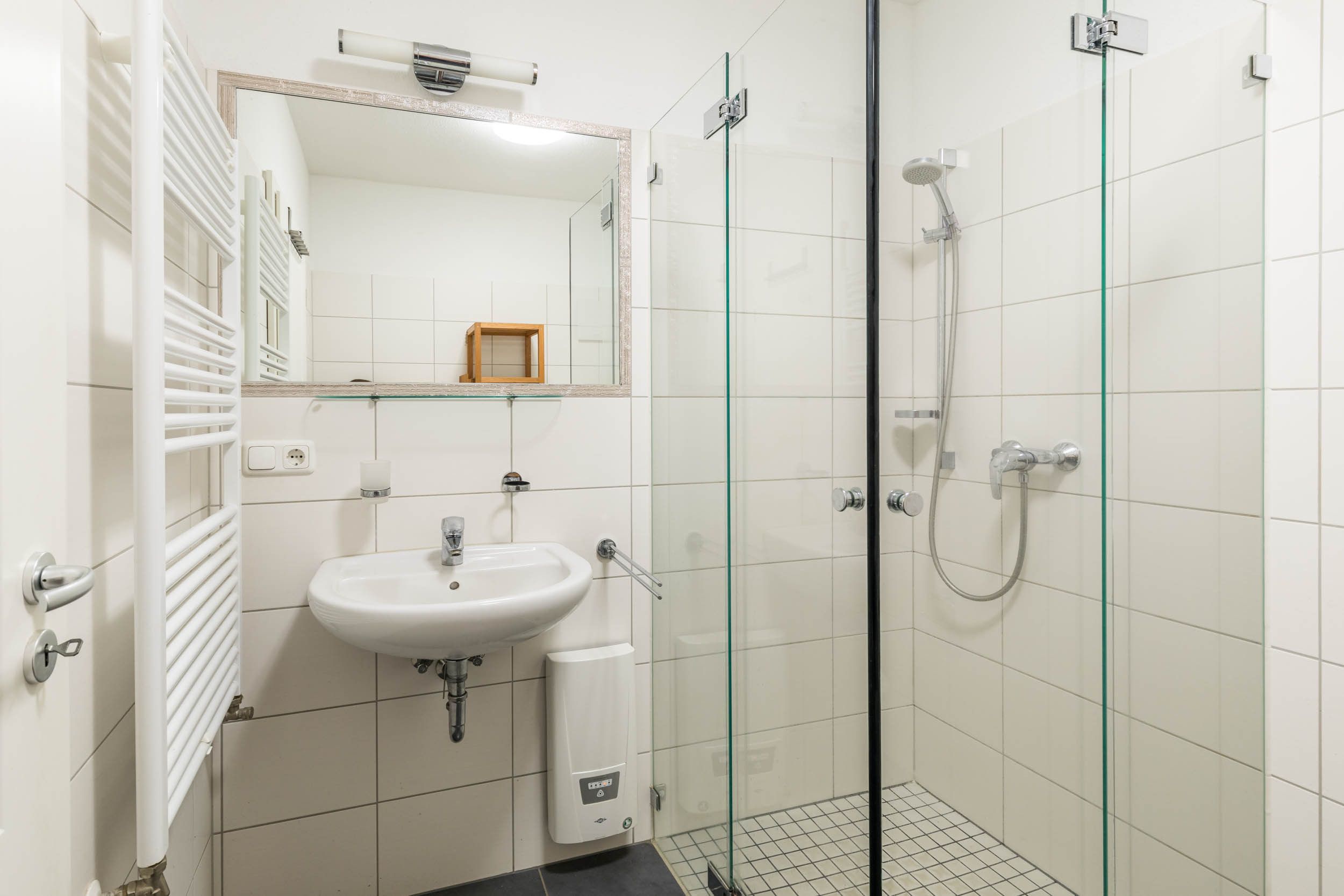 Das Bad ist mit ebenerdiger Dusche, WC, Föhn und Handtuchtrockner ausgestattet.