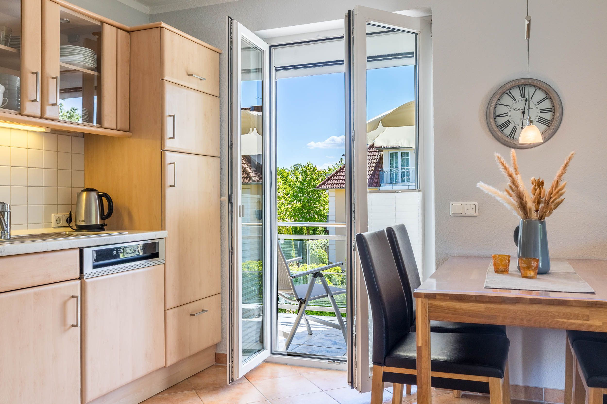 In der zum Wohnzimmer hin offenen Küche finden Sie alle notwendigen technischen Geräte – wie Spülmaschine, Kühlschrank mit Gefrierfach, Mikrowelle, Kaffeemaschine und Herd bzw. Backofen. Ihre Mahlzeiten können Sie bequem an der separaten Essecke einnehmen.