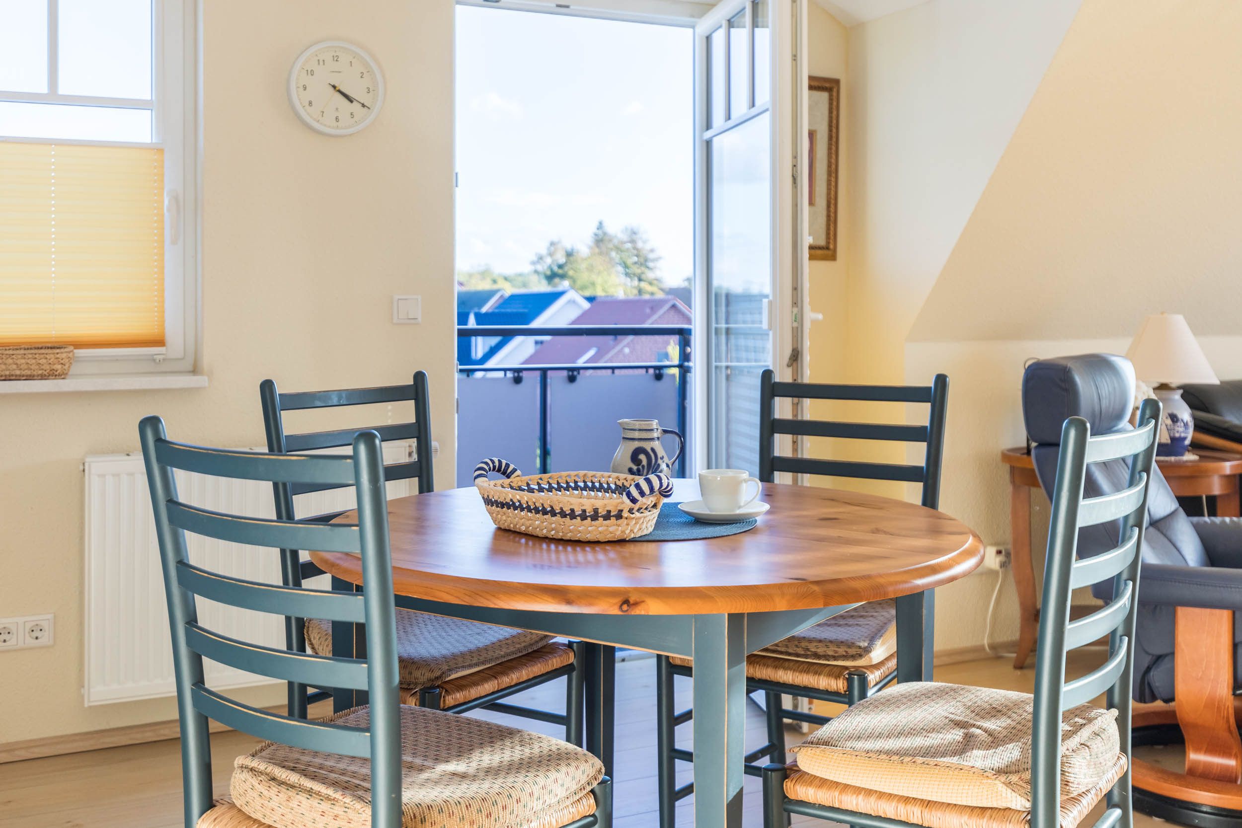 Das hell eingerichtete Wohn- und Esszimmer verfügt über ein gemütliches Sofa und einem passenden Sessel sowie einen schönen Essbereich mit direktem Zugang zu den beiden möblierten Balkonen (Südost und Südwest). Ein Flatscreen-TV und eine kleine Musikanlage dienen hier zu Ihrer Unterhaltung.