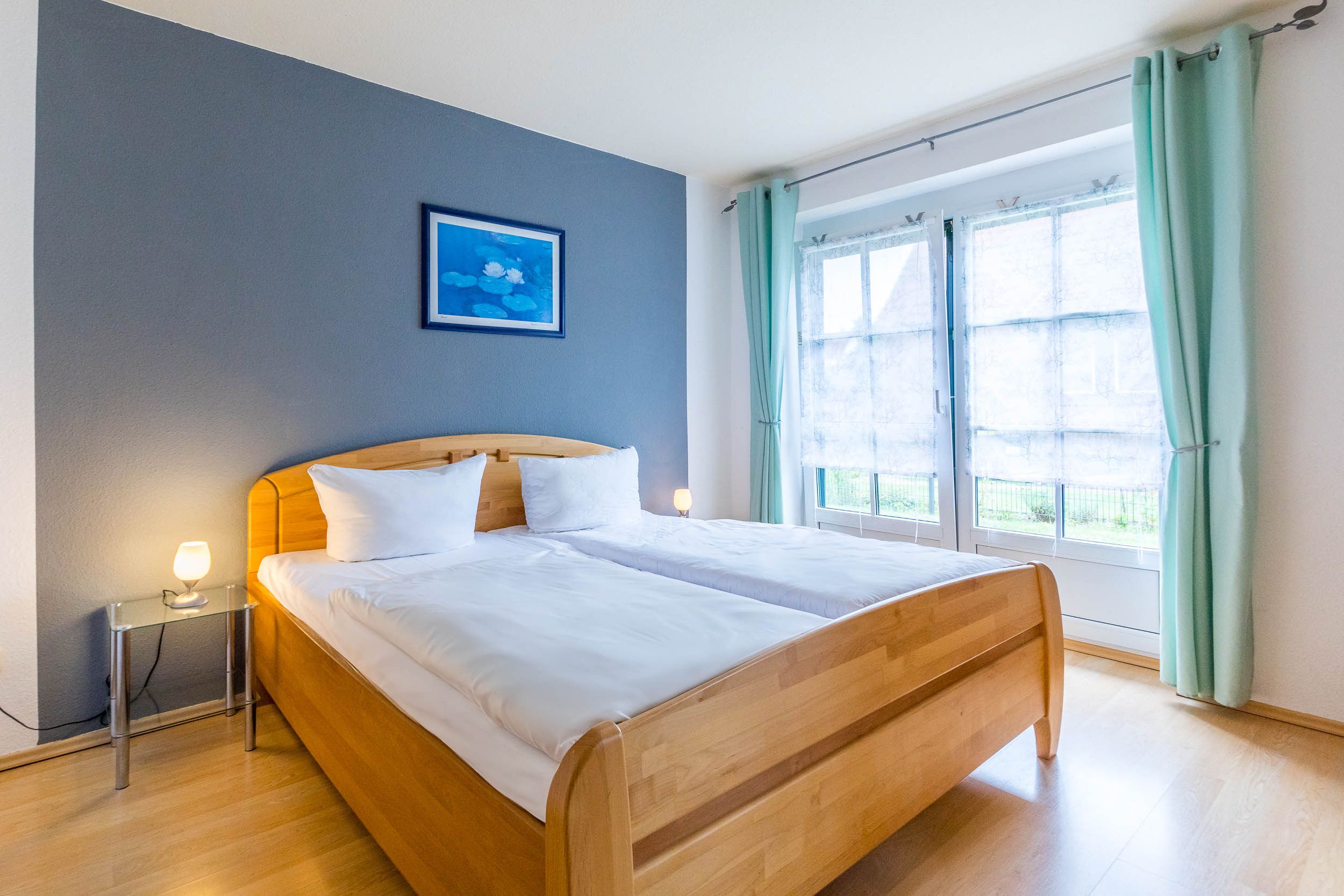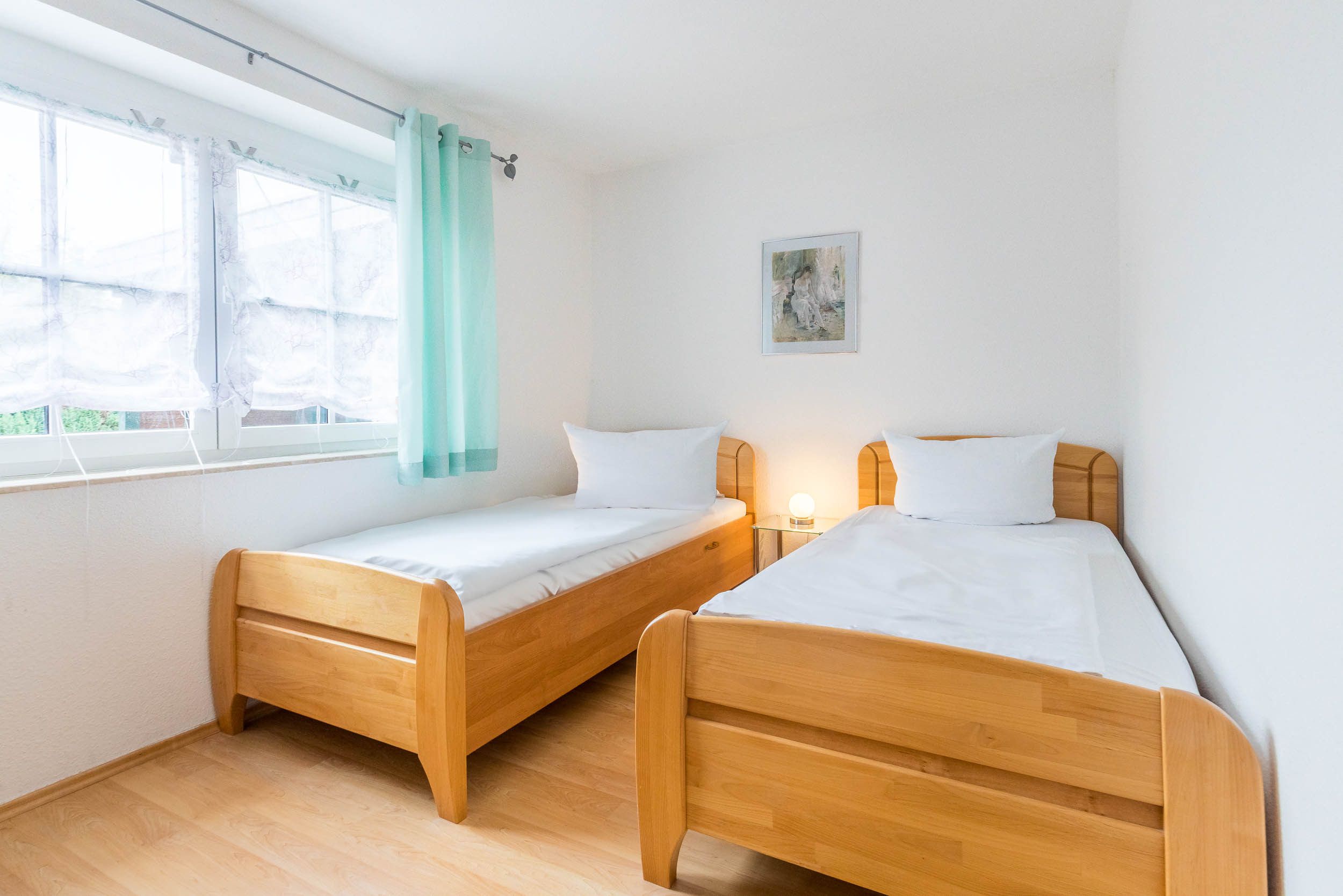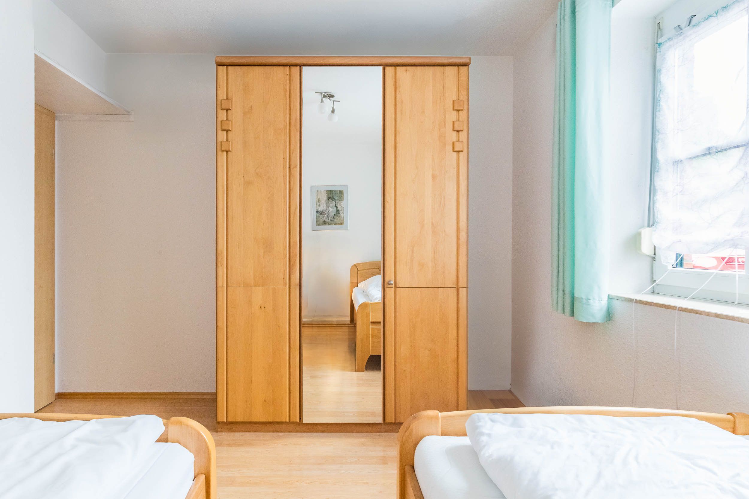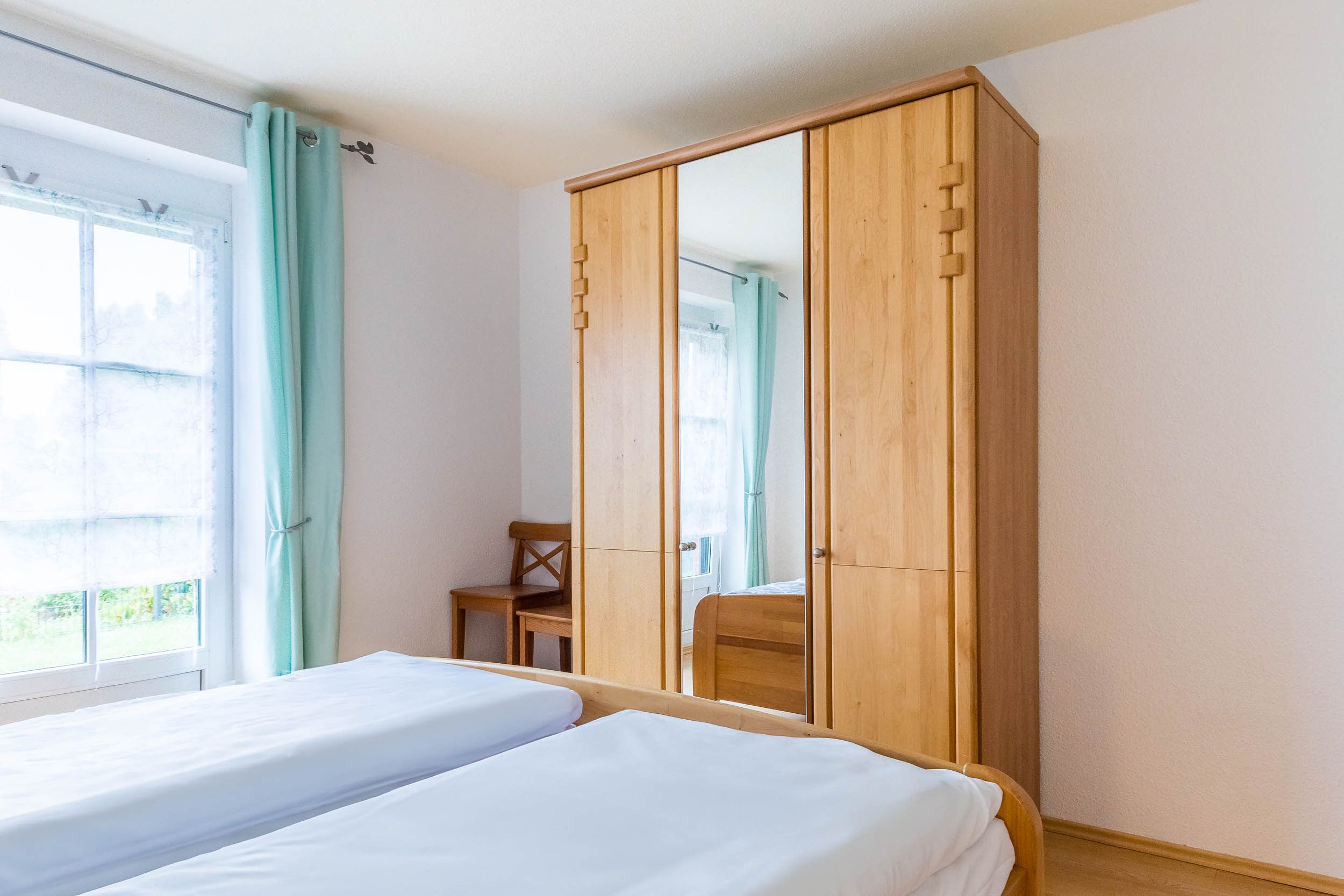 Die Ferienwohnung ist mit 2 Schlafräumen ausgestattet: Im Schlafzimmer befindet sich ein bequemes Doppelbett (180x200cm/ Höhe 56cm), das Gästezimmer ist mit zwei Einzelbetten (je 100x200cm/ Höhe 56cm) eingerichtet, alle Lattenroste sind verstellbar. Auch einen Kleiderschrank finden Sie in jedem Schlafzimmer.