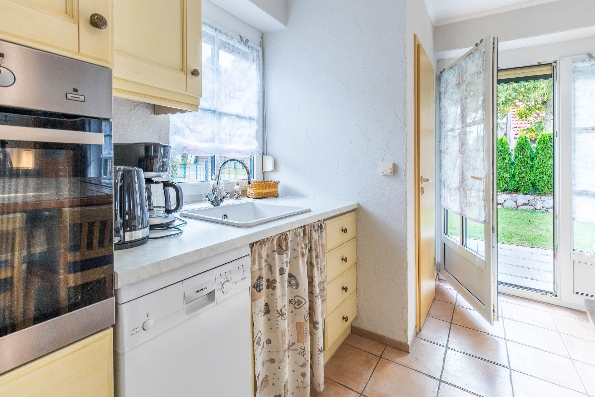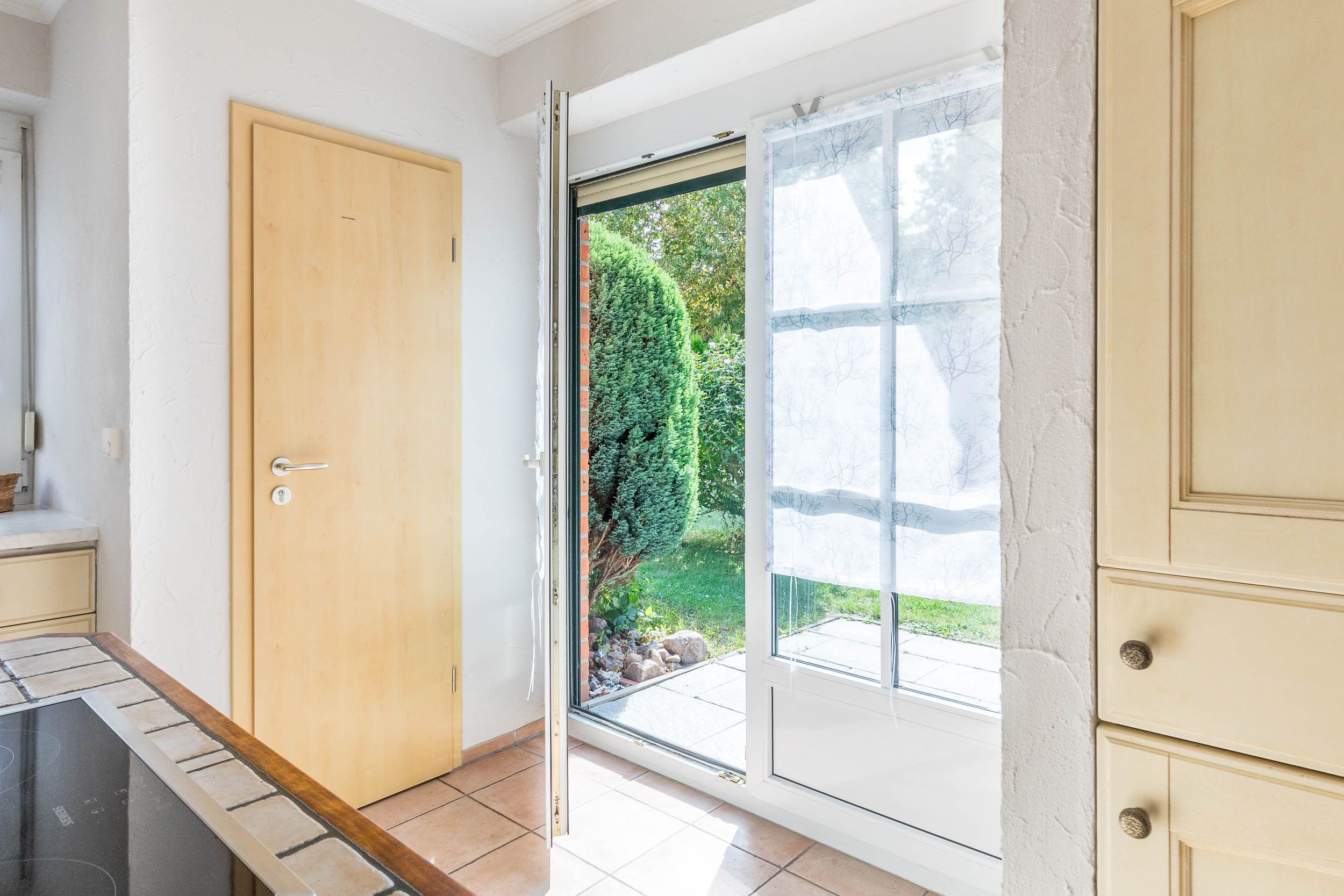 Die möblierte Südwestterrasse erreichen Sie sowohl über den Wohn- als auch über den Küchenbereich.
