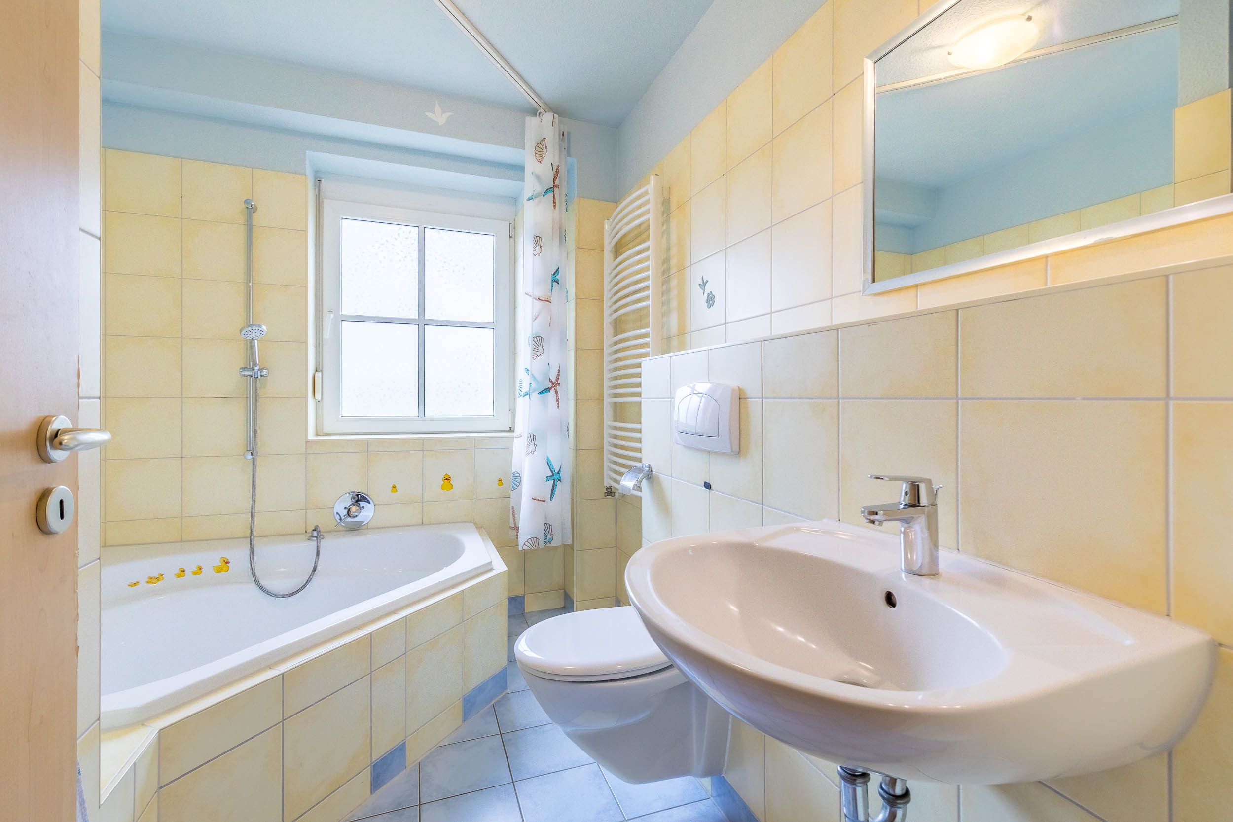 Im Badezimmer lädt eine Eckbadewanne zum Entspannen in wohltemperiertem Wasser ein. Auch Waschmaschine ist hier installiert. Das Fenster spendet angenehmes Tageslicht und hilft beim Lüften nach dem Baden/ Duschen. Der Handtuchtrockner spendet zusätzlich wohlige Wärme im Bad.