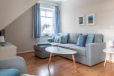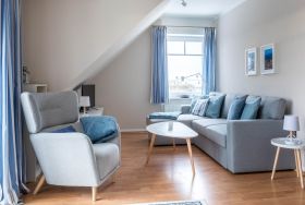 Diese geschmackvoll eingerichtete Wohnung begrüßt Sie in der unteren Wohnebene mit einem Wohnbereich mit maritimen Flair. So finden Sie Sie hier eine farblich abgestimmte Couchgarnitur mit SAT-TV auf der einen Seite des Raumes, während auf der anderen Seite eine sehr gut ausgestattete Wohnküche mit gemütlicher Essecke auf Sie wartet.