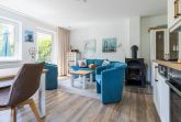 Der komfortabel ausgestattete Wohnbereich mit einem Kamin im Erdgeschoss und einer gemütlichen Essecke ist mit dem modern ausgestatteten Küchenbereich verbunden. Flatscreen-TV (Sat) und Musikanlage sorgen hier für Unterhaltung.