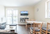 Sie verfügt über einen offenen Wohn- und Essbereich mit integrierter Küchenzeile und Zugang zum Südost-Balkon (zum Hinterhaus). Das bequeme Sofa lädt zum gemütlichen Beisammensein oder zum Entspannen beim Fernsehen ein.