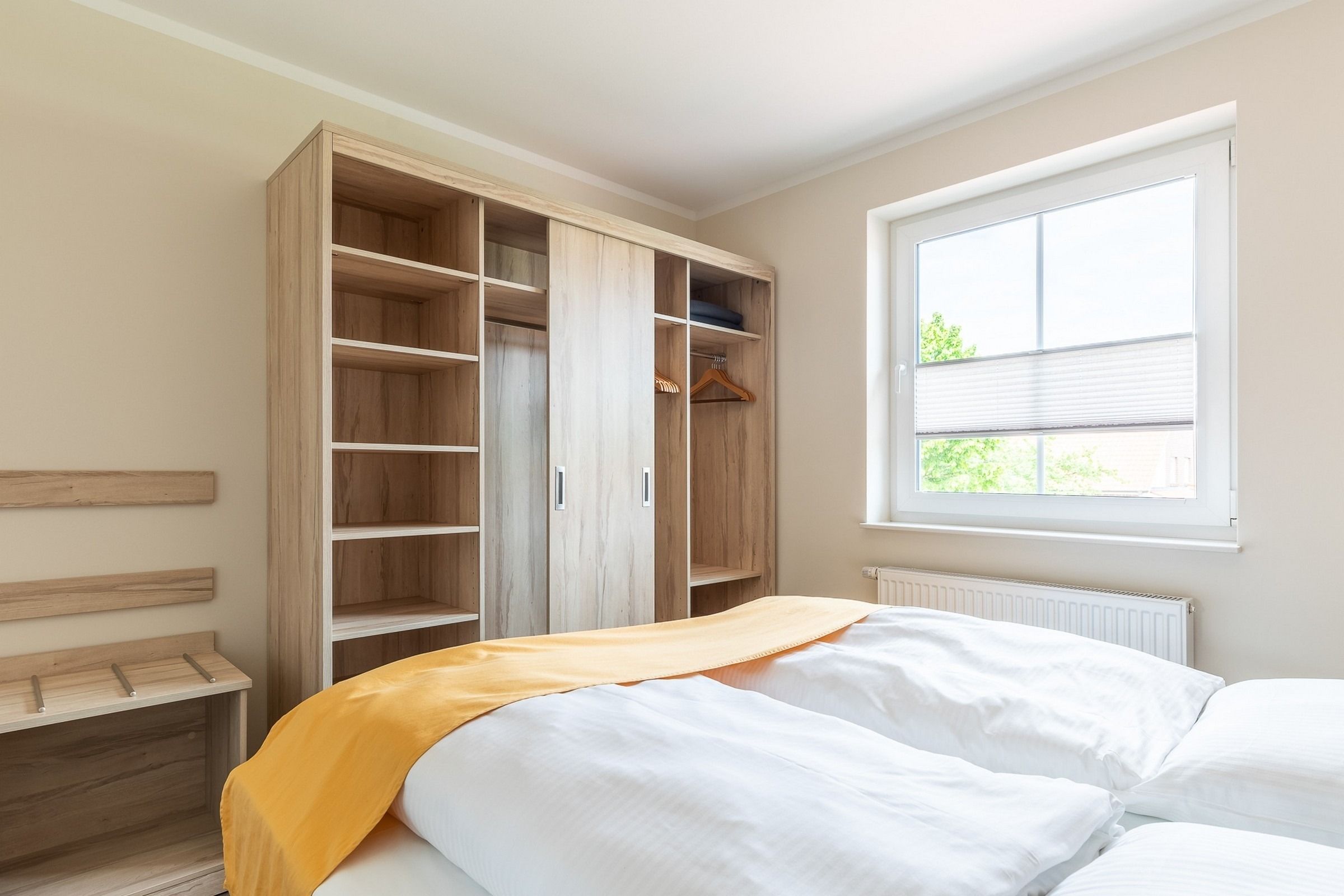 Das Schlafzimmer ist mit einem Doppelbett und einem geräumigen Kleiderschrank, das Gästezimmer mit einem Einzelbett und TV ausgestattet.