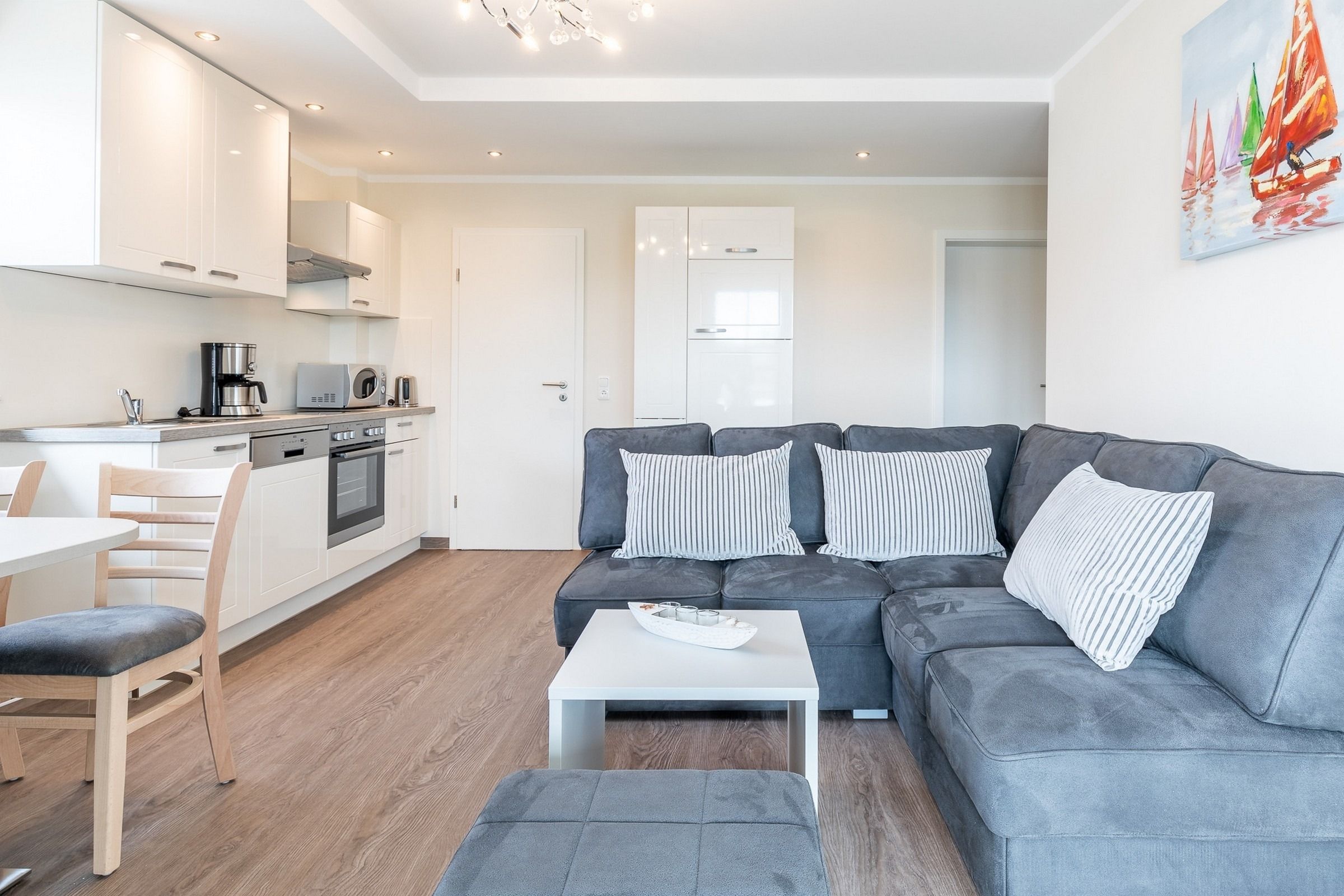 Die im 1.OG hell und modern eingerichtete 3-Zimmer-Ferienwohnung verfügt über etwa 55qm Wohnfläche und bietet eine komfortable Ausstattung für 3 Gäste.