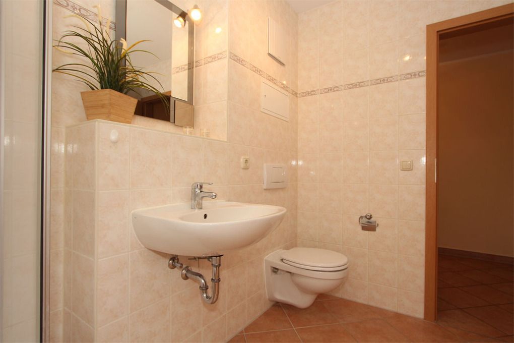 Das geräumige Bad umfasst eine Dusche, WC, Waschbecken und einen Föhn.