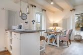 Der Wohnbereich ist in hellen Farben und Holzoptik gemütlich und modern eingerichtet. Die moderne Einbauküche verfügt über Geschirrspüler, Ceranherd, Backofen, Kühlschrank mit Gefrierfach, Wasserkocher, Kaffeemaschine, Kaffeevollautomat, Toaster, Eierkocher, Waffeleisen, Mixer und zahlreiche Küchenutensilien.