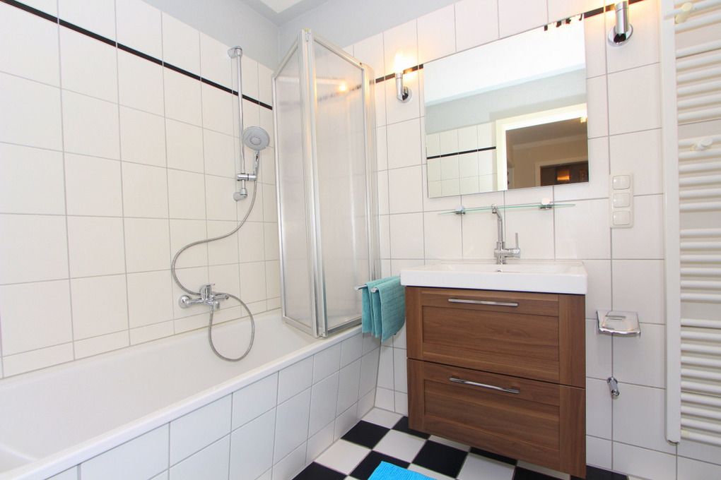 Zur Ausstattung des Badezimmers gehören eine Badewanne mit integrierter Dusche sowie Handtuchtrockner und Waschmaschine.