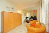 Die Wohnung verfügt über einen verbundenen Wohn- und Essbereich mit bequemer Ledercouch, Relax-Sessel und Korbsesseln. Der Flatscreen-TV sorgt für Unterhaltung. Ein ausziehbares Schrankbett bietet im Wohnbereich zwei Schlafplätze.