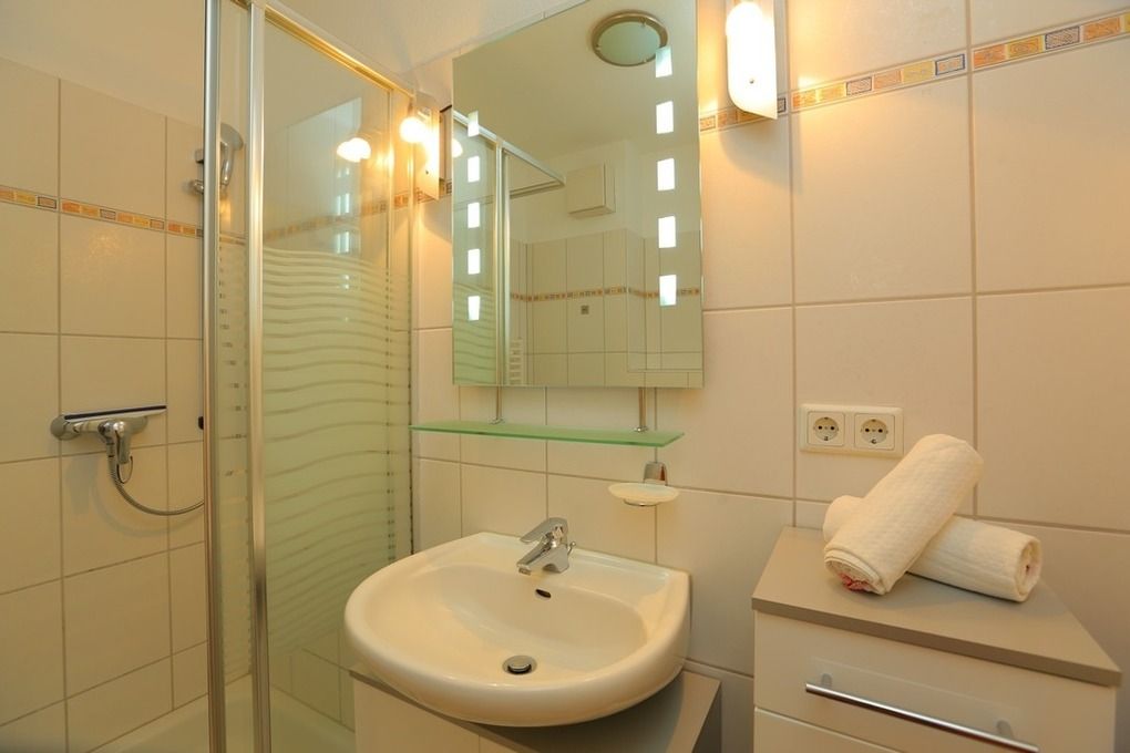 Das hell geflieste Bad mit Dusche und WC lässt Sie gut in den Urlaubstag starten.