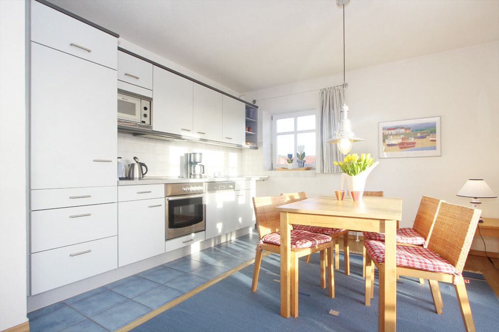 Die direkt angrenzende, offene Küchenzeile bietet eine hervorragende Ausstattung für Ihre Selbstverpflegung, wie z.B. Backofen, Cerankochfeld, Mikrowelle, Geschirrspüler, Kaffeemaschine und Kühlschrank mit Gefrierfach usw. Ebenso finden Sie hier einen schönen Essbereich mit ausreichend Platz.