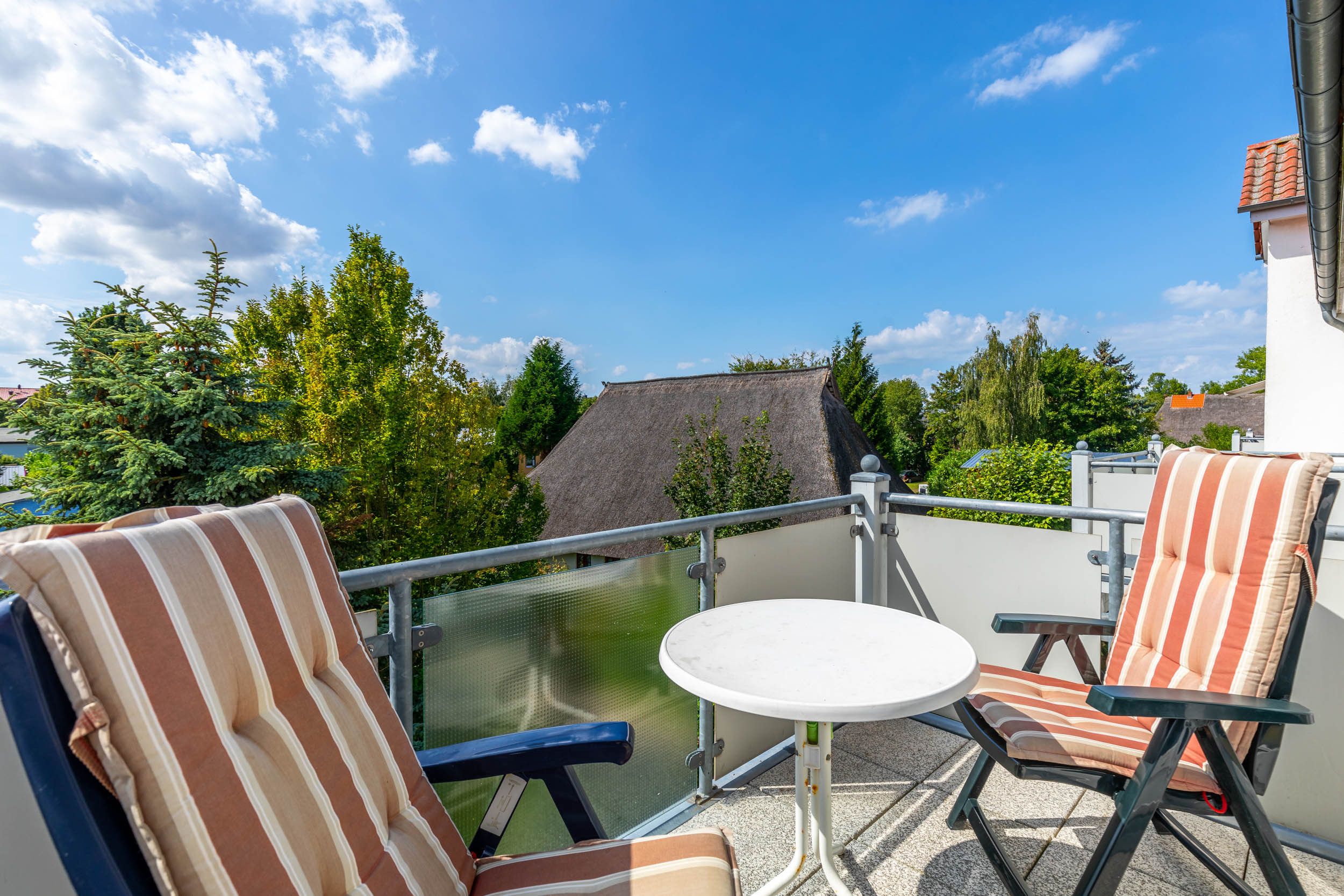 Vom Wohnzimmer aus haben Sie Zugang zum möblierten Südwestbalkon. Eine Markise kann als Sonnenschutz genutzt werden.