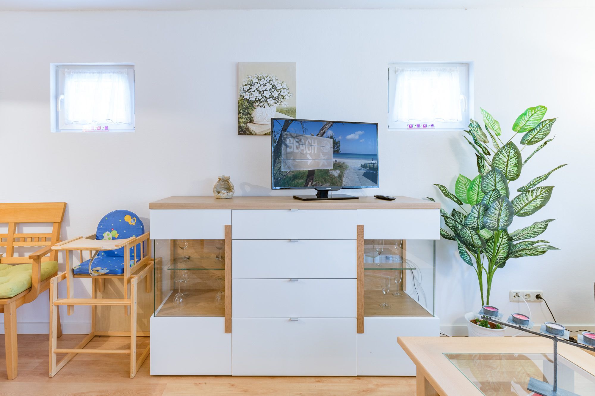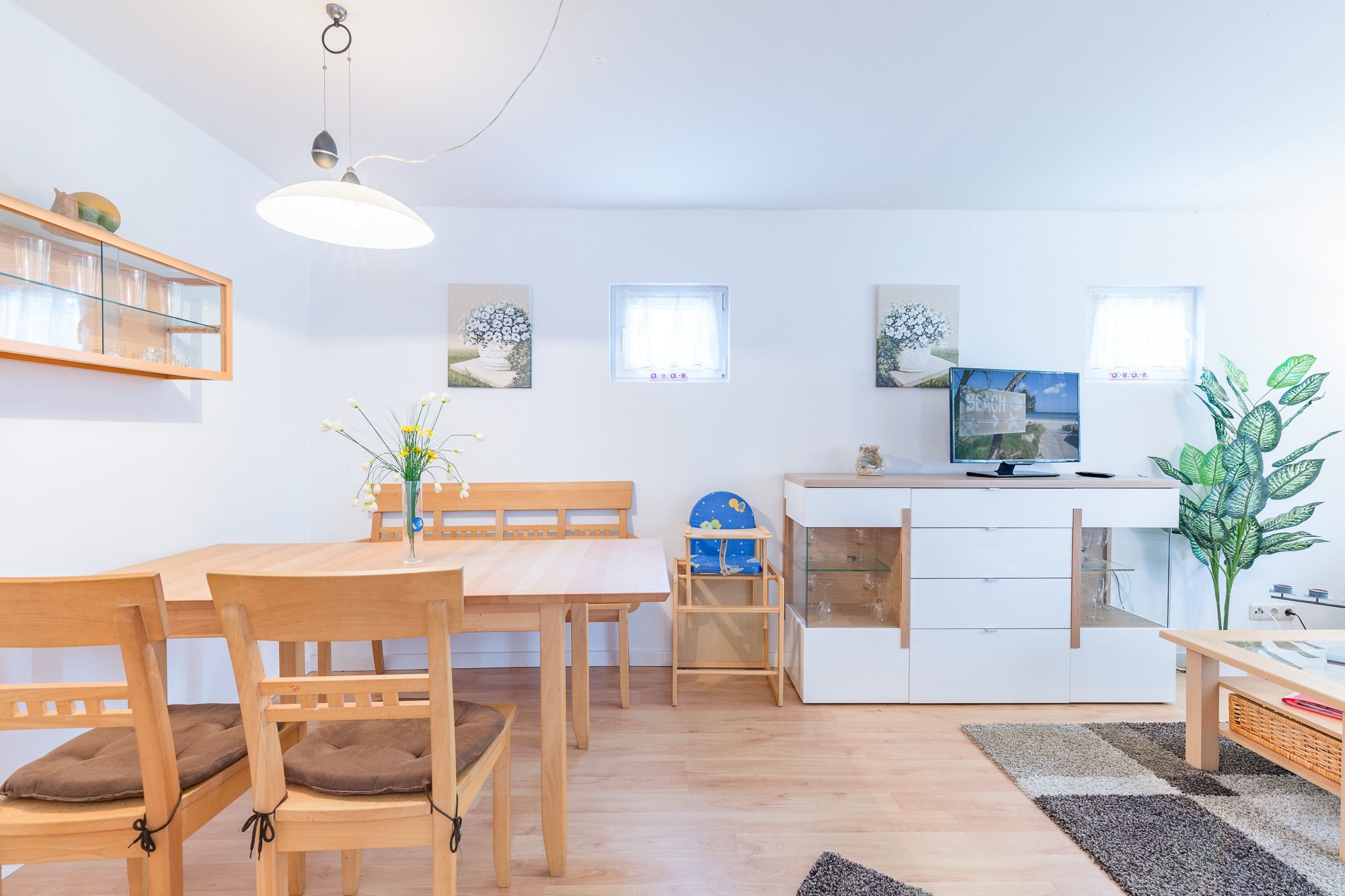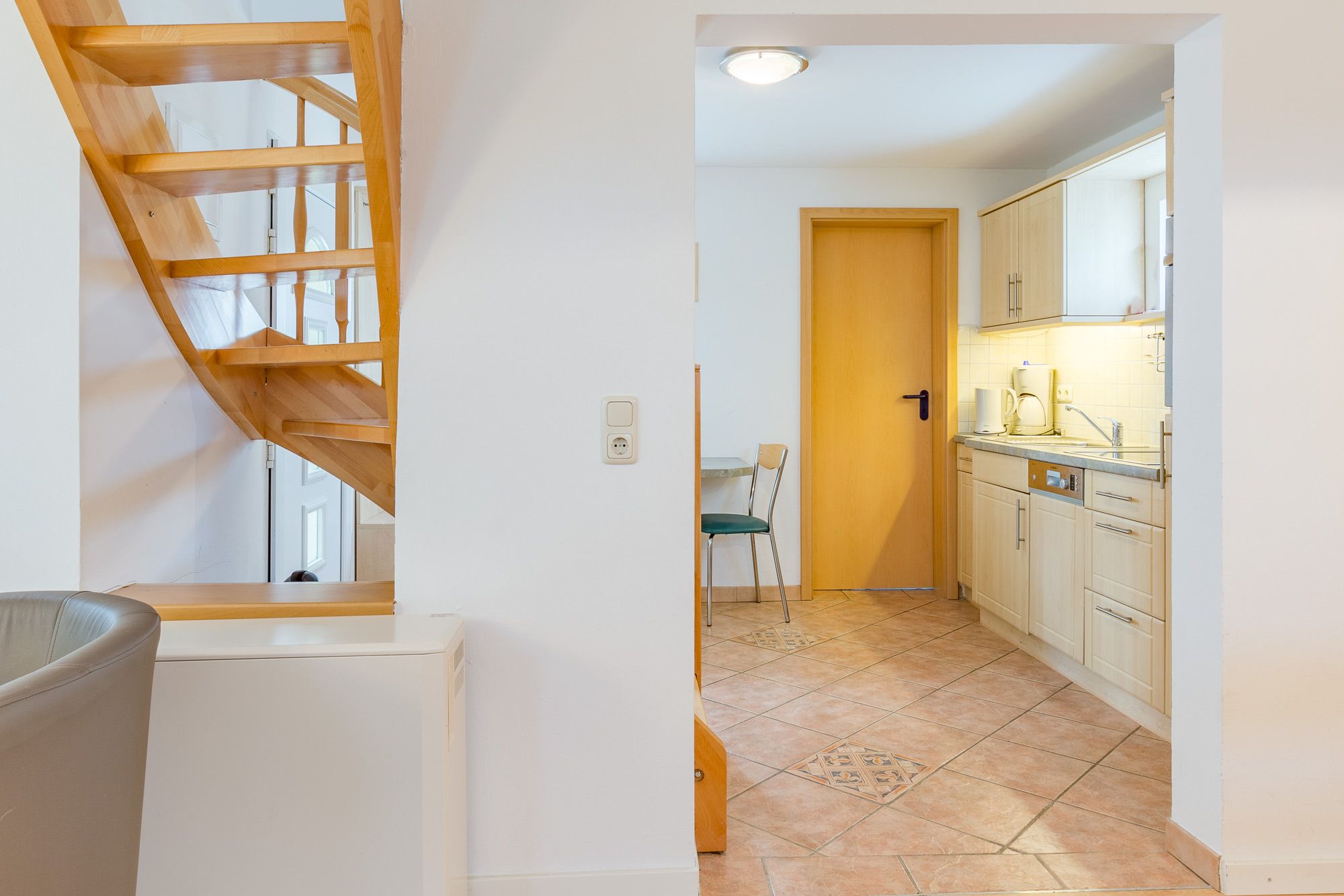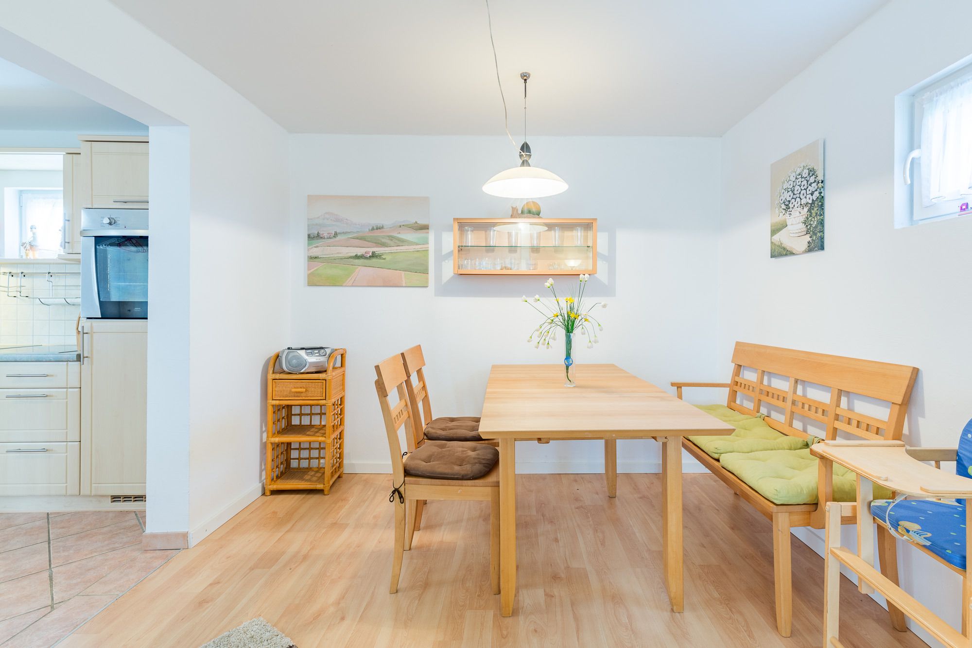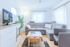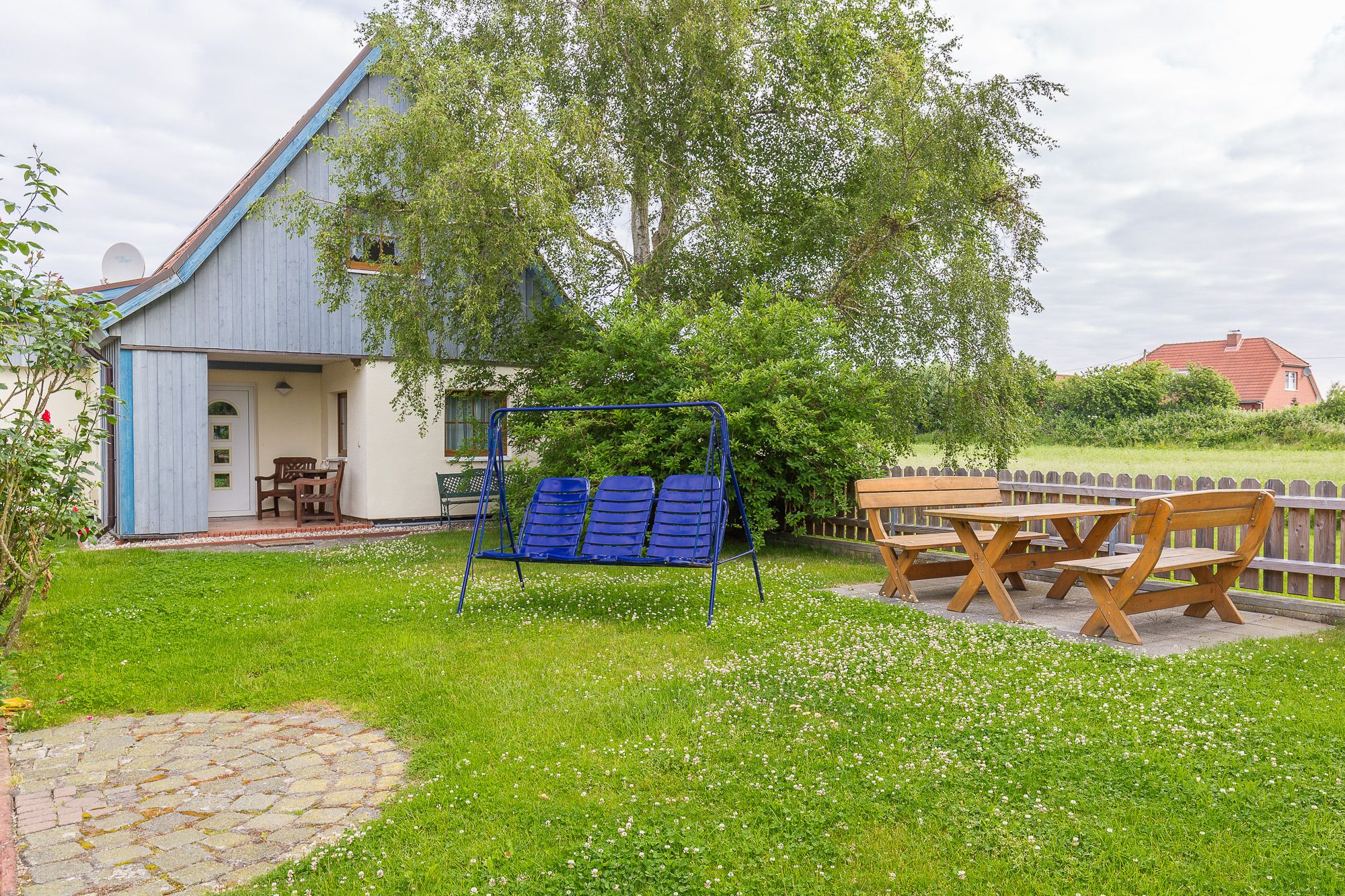 Neben dem Wohn-/Essbereich befindet sich eine moderne, offene Küchenzeile. Hier können Sie das Ceran Kochfeld, den Backofen, den Kühlschrank mit Gefrierfach, Geschirrspüler, Kaffeemaschine, Wasserkocher und Toaster nutzen. Im Garten stehen Sitzgelegenheiten für Sie bereit. Der weitläufige, begrünte Garten bietet viel Platz zum Spielen, Toben und Faulenzen.