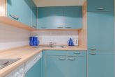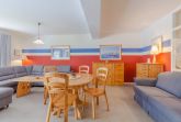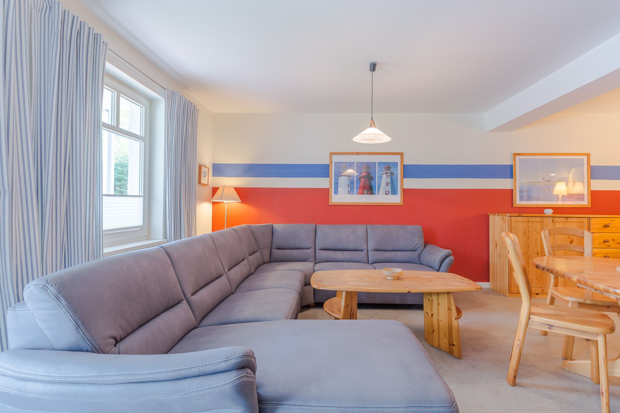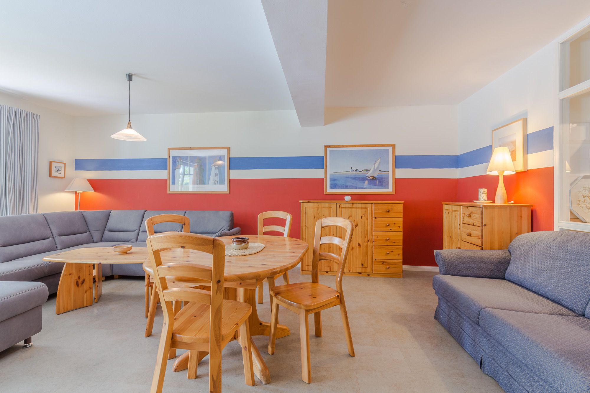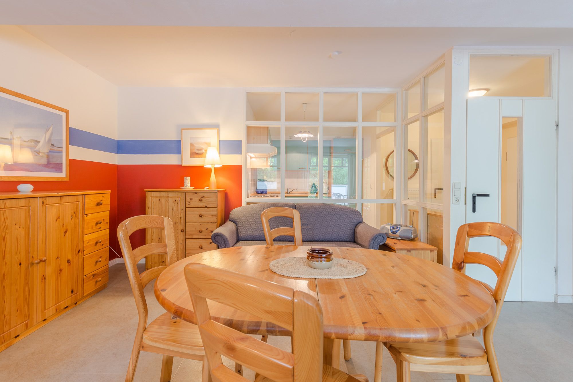 Diese 2-Zimmer-Ferienwohnung befindet sich im Erdgeschoss und bietet mit Ihren 60 m² Platz für bis zu 4 Personen. Das gemütliche Wohnzimmer ist mit einem Esstisch mit 4 Stühlen und einer bequemen Sitzgruppe ausgestattet. Die Sitzgruppe ist auch als Schlafsofa für 2 Personen möglich. Die separate, voll ausgestattete Küche ist durch ein dekoratives Glaselement vom Wohnzimmer getrennt.