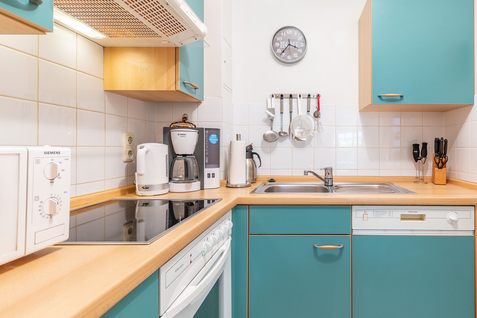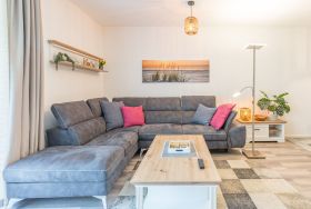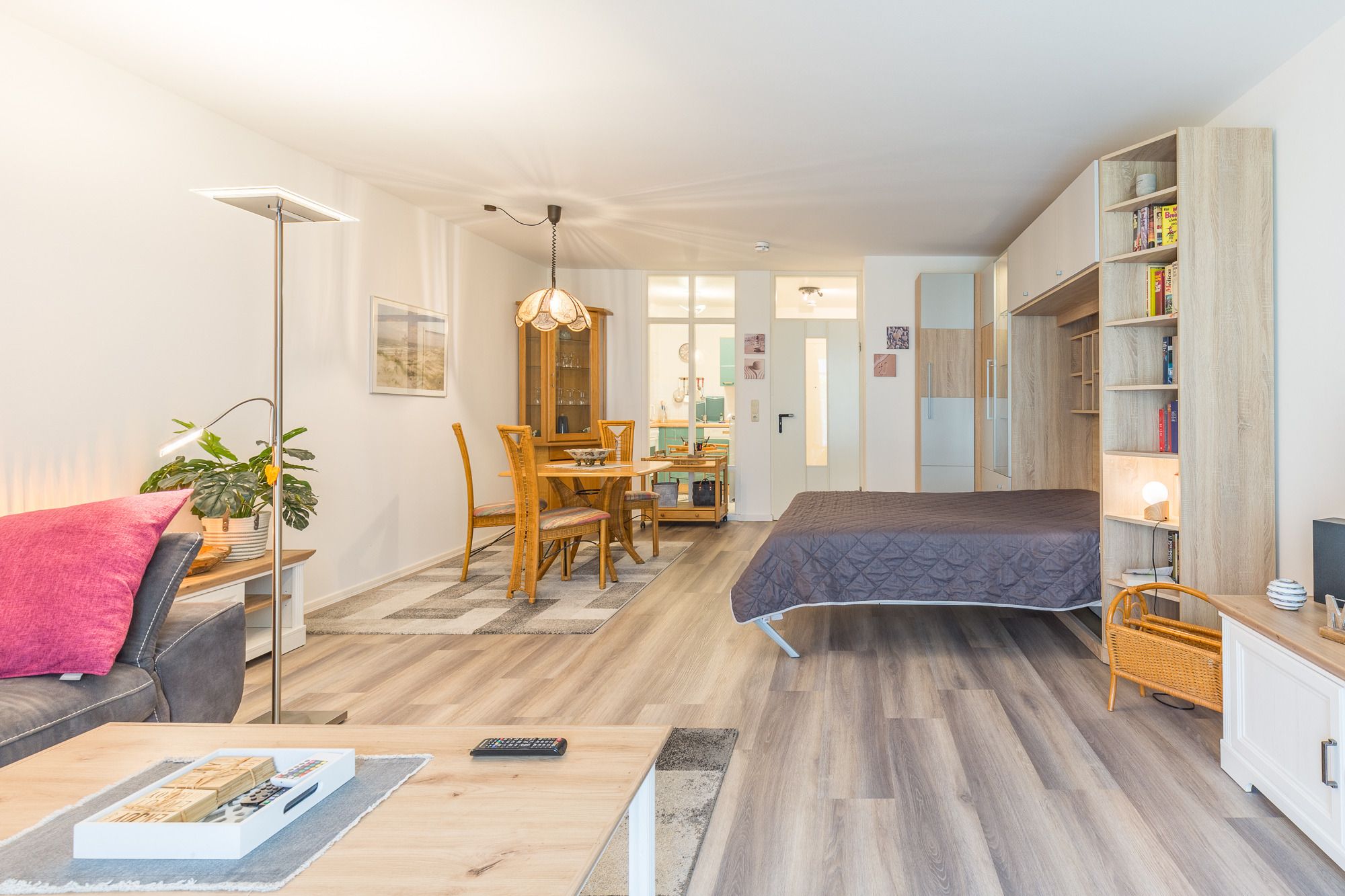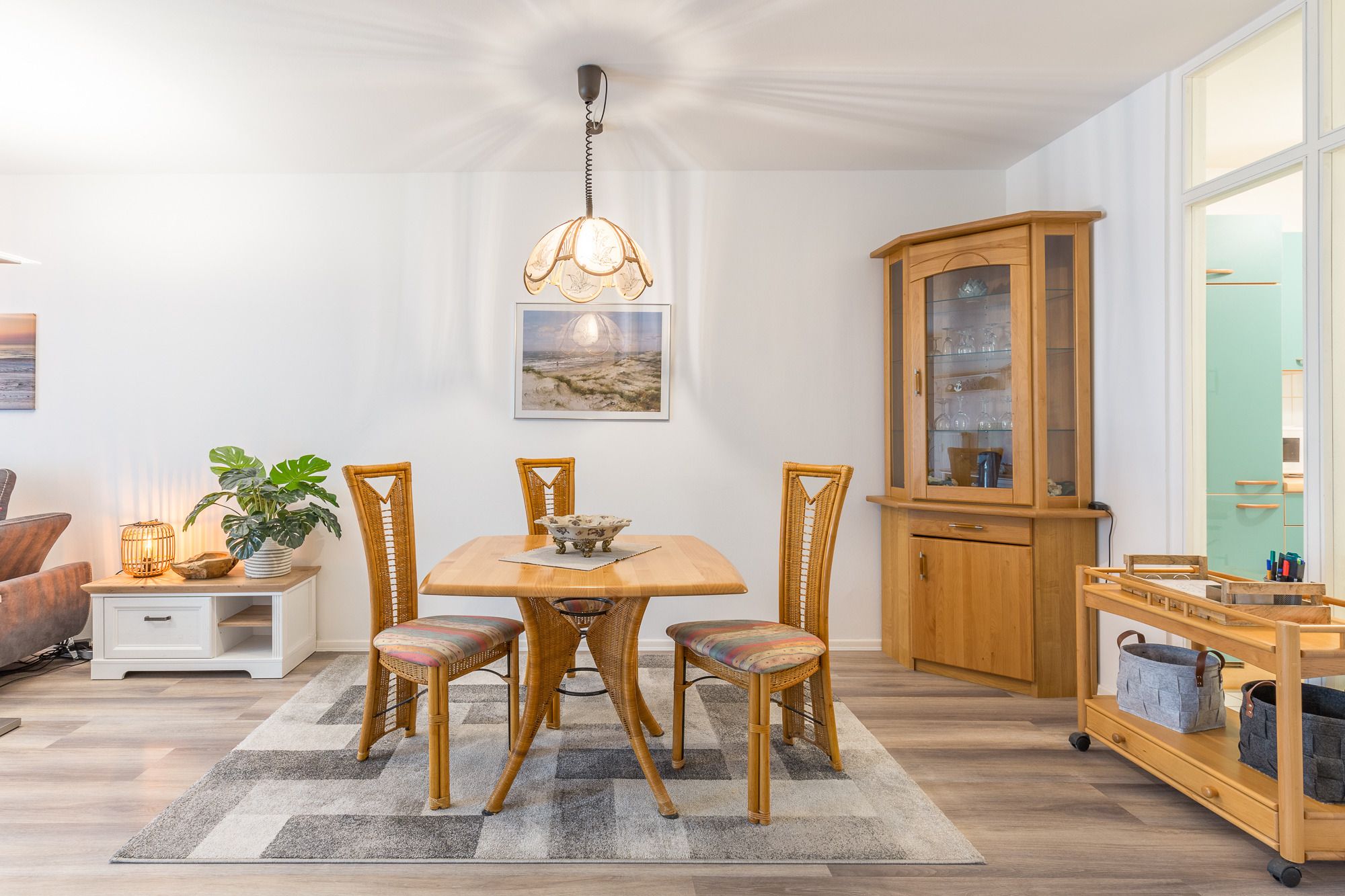 Die separate voll ausgestattete Küche ist durch ein Glaselement vom Wohn- und Schlafbereich getrennt. Das Wohnzimmer besitzt zusätzlich eine gemütliche Sofaecke zum Entspannen, sowie einen Esstisch mit 4 Stühlen. Im Wirtschaftsraum der Ferienwohnung finden Sie einen Staubsauger sowie weitere Haushaltsutensilien.
