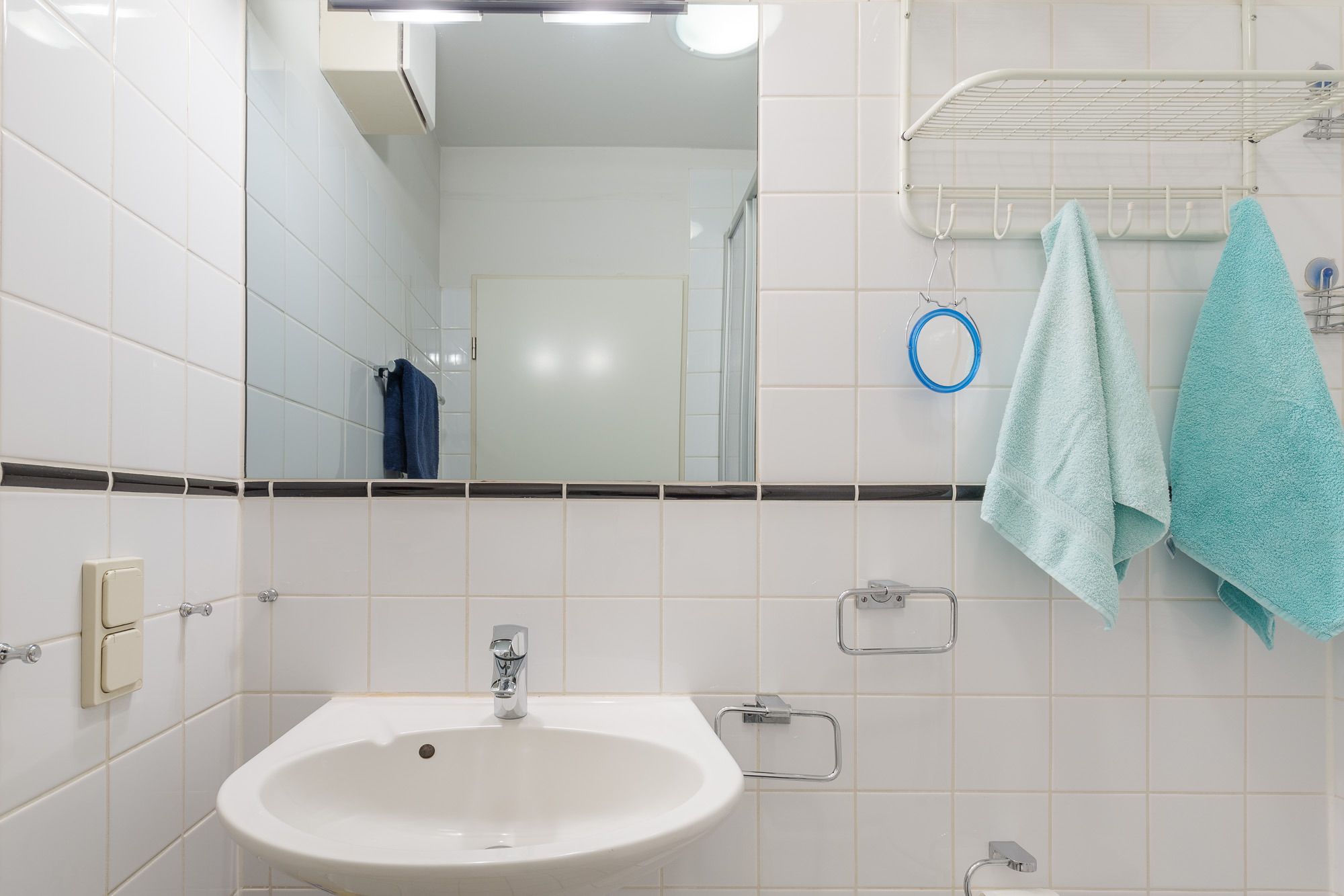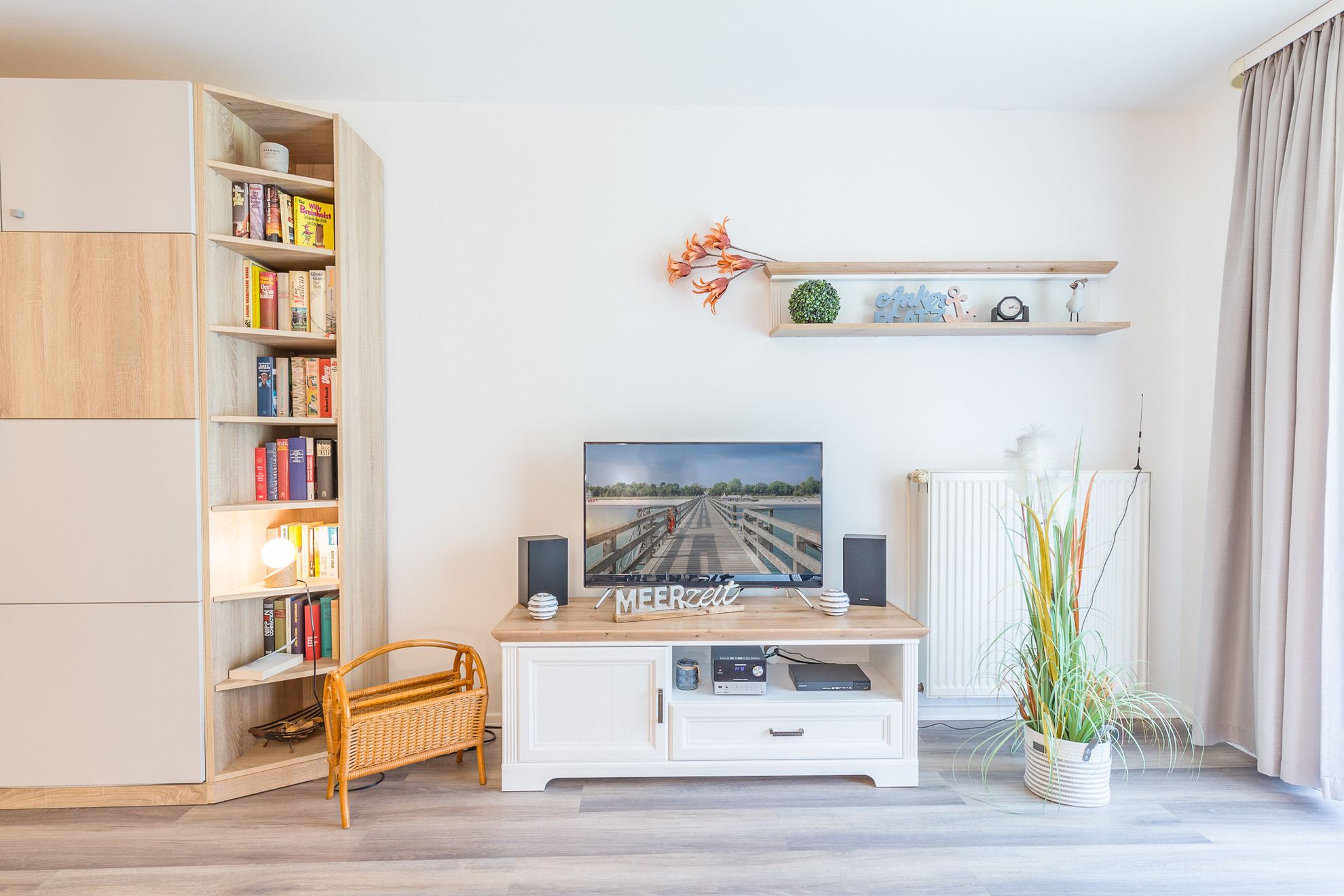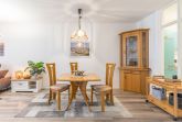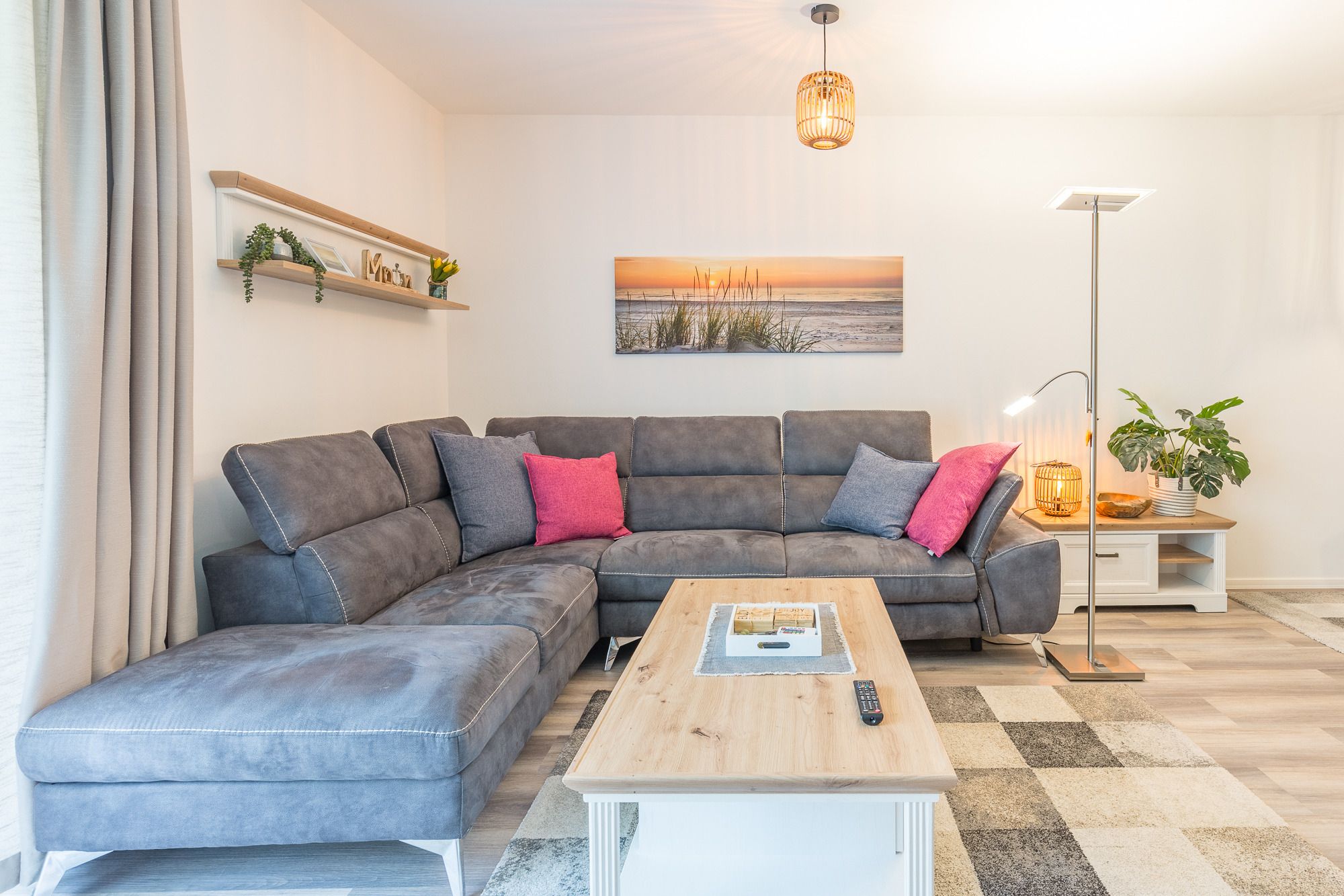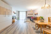 Die separate voll ausgestattete Küche ist durch ein Glaselement vom Wohn- und Schlafbereich getrennt. Das Wohnzimmer besitzt zusätzlich eine gemütliche Sofaecke zum Entspannen, sowie einen Esstisch mit 4 Stühlen. Im Wirtschaftsraum der Ferienwohnung finden Sie einen Staubsauger sowie weitere Haushaltsutensilien.