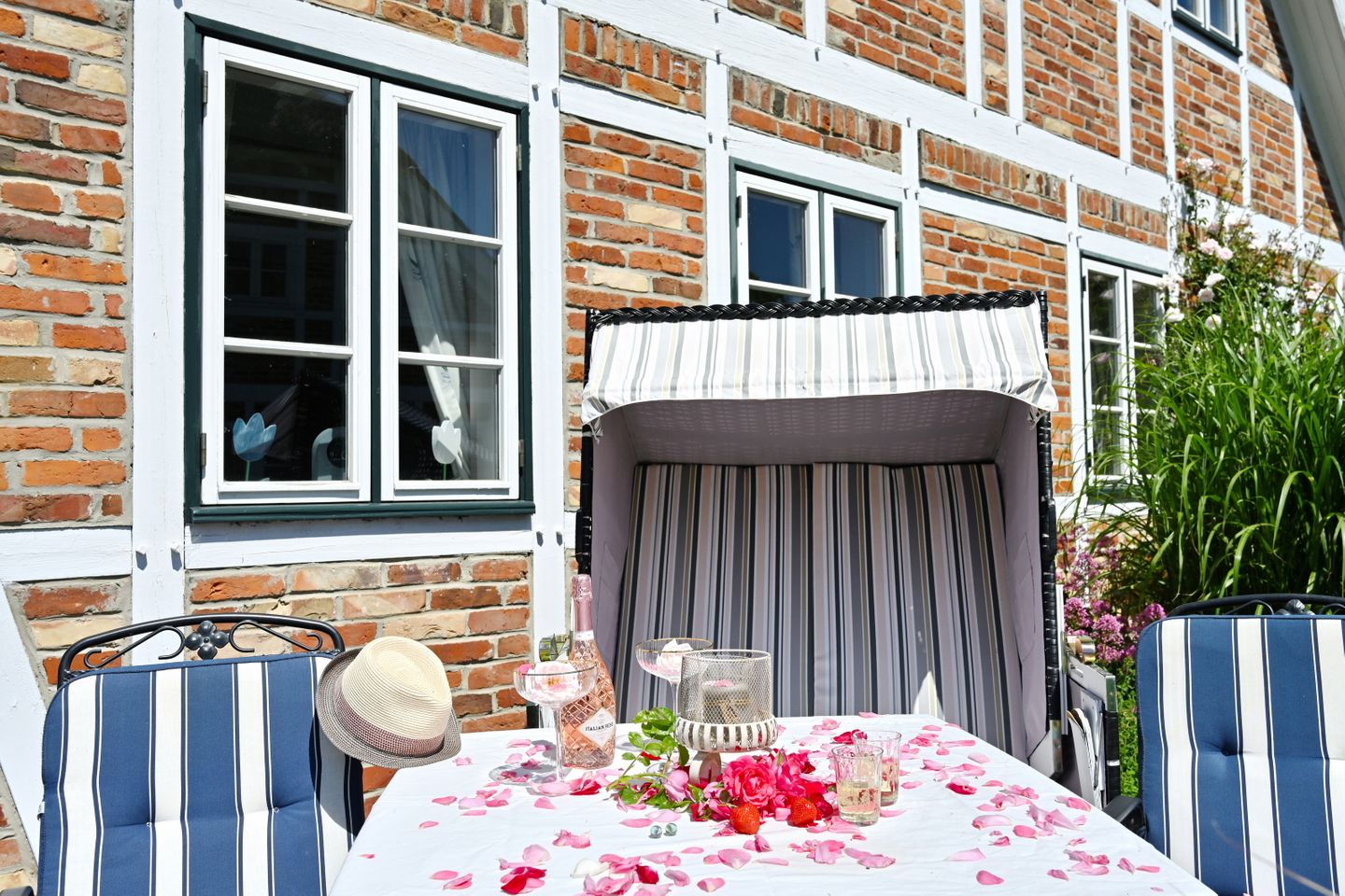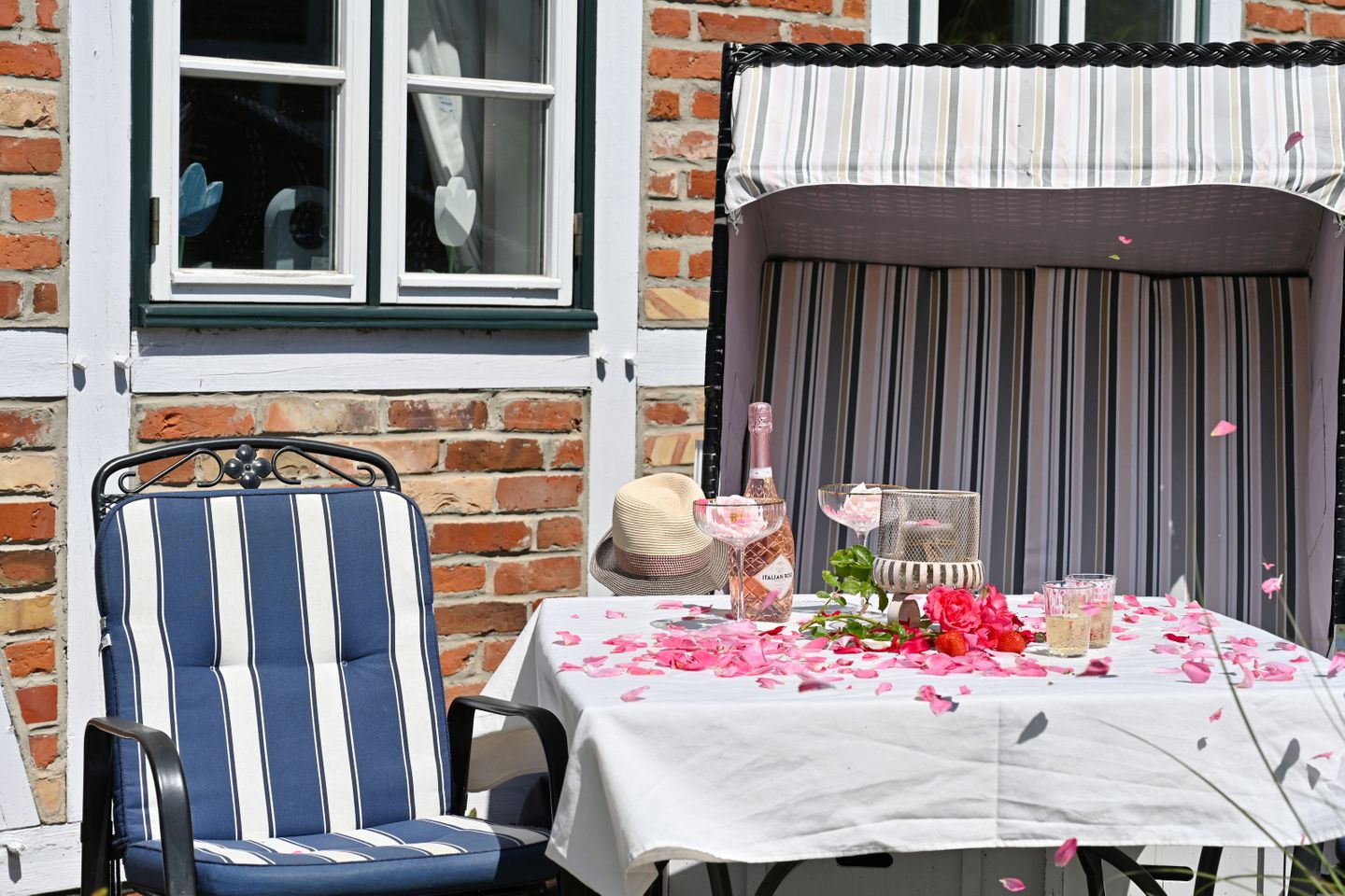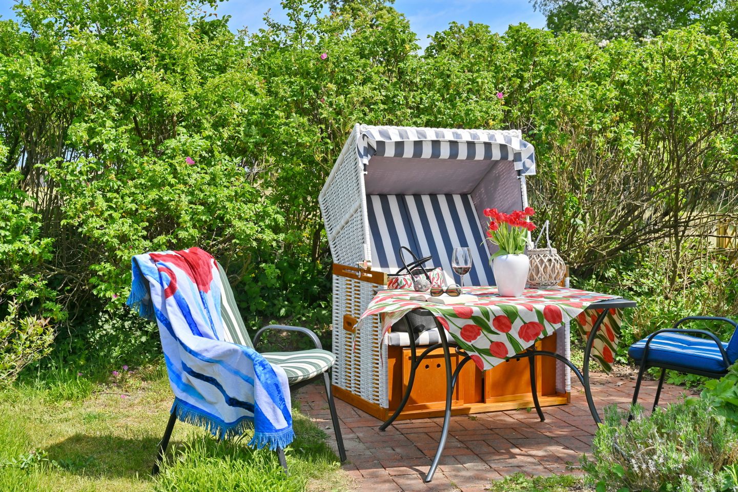 Zu jeder der Wohnungen gehört eine separate Terrasse in der wunderschönen großen Gartenanlage incl. Strandkorb und Gartenmöbeln.