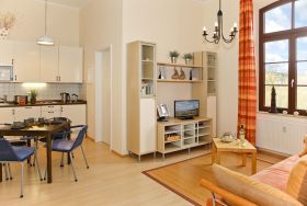 Die moderne 2-Zimmer-Ferienwohnung befindet sich im Hochparterre und zur Vorderseite des historischen Gebäudes. Sie ist für 3 Personen ausgestattet