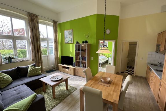 Die 2 Zimmer Wohnung im Erdgeschoss mit stilvollem Ambiente, ist großzügig aufgeteilt und komfortabel ausgestattet. Sie verfügt über eine Terrasse zur ruhigen Westseite mit einem eingeschränkten Meerblick.