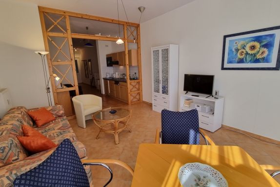 Das Appartement befindet sich im Erdgeschoss des Hauses und verfügt über einen Wohnbereich mit offener Küchenzeile, einer Schlafcouch, einem Fernseher und einem Esstisch.