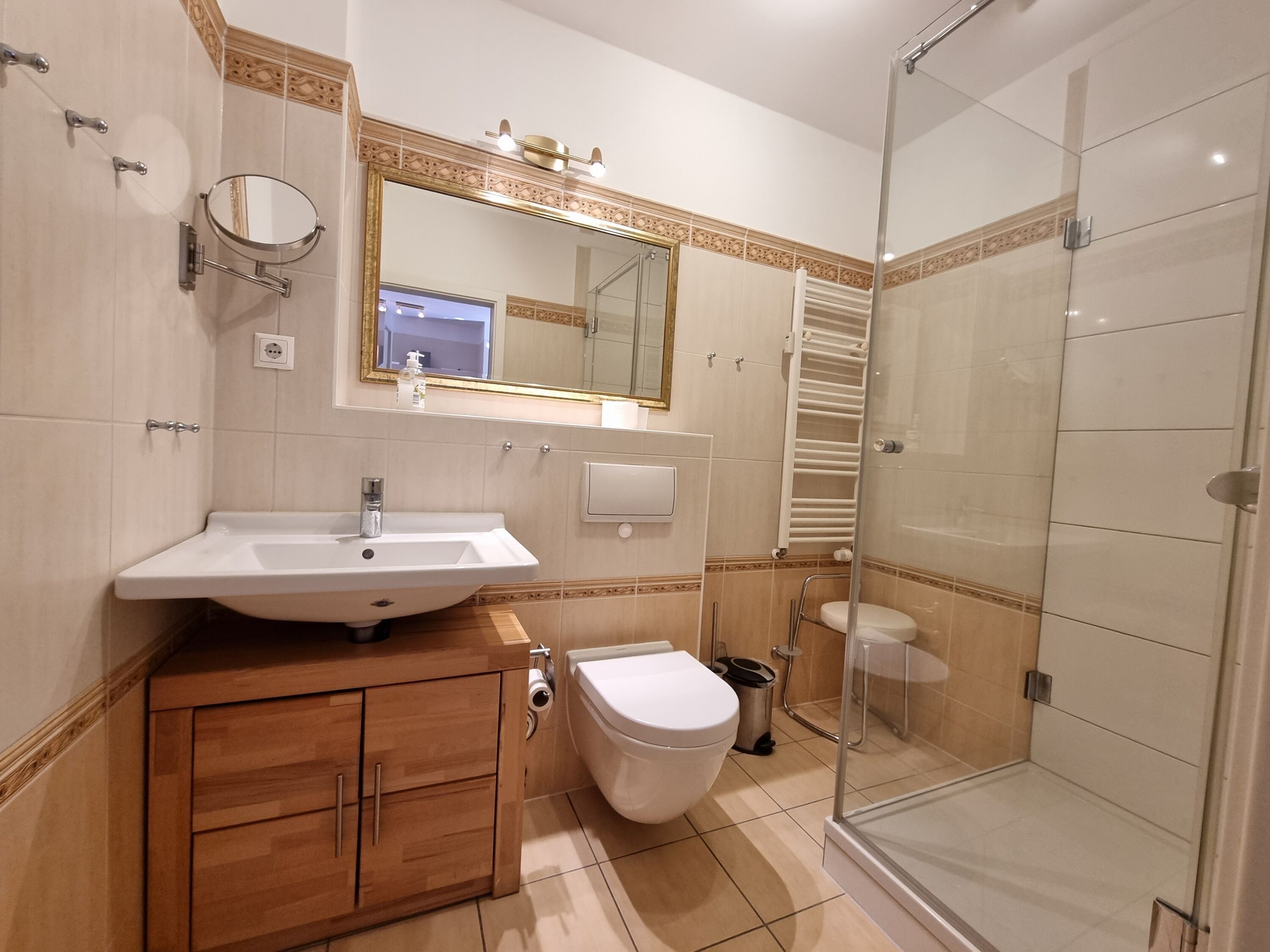Eine Terrasse lädt zum Verweilen ein. Ein Duschbad/WC rundet die Ferienwohnung ab. Die Ferienwohnung ist mit Fliesen ausgestattet. Die Schlafzimmer verfügen über einen hochwertigen Vinyl-Boden.