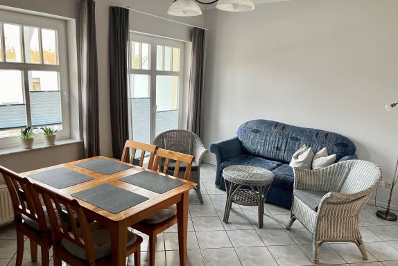Es erwartet Sie ein gemütlich eingerichteter Wohnbereich mit Sitzgruppe, Esstisch und integrierter Küchenzeile, die mit Ceran- Kochfeld, Backofen und Mikrowelle ausgestattet ist.