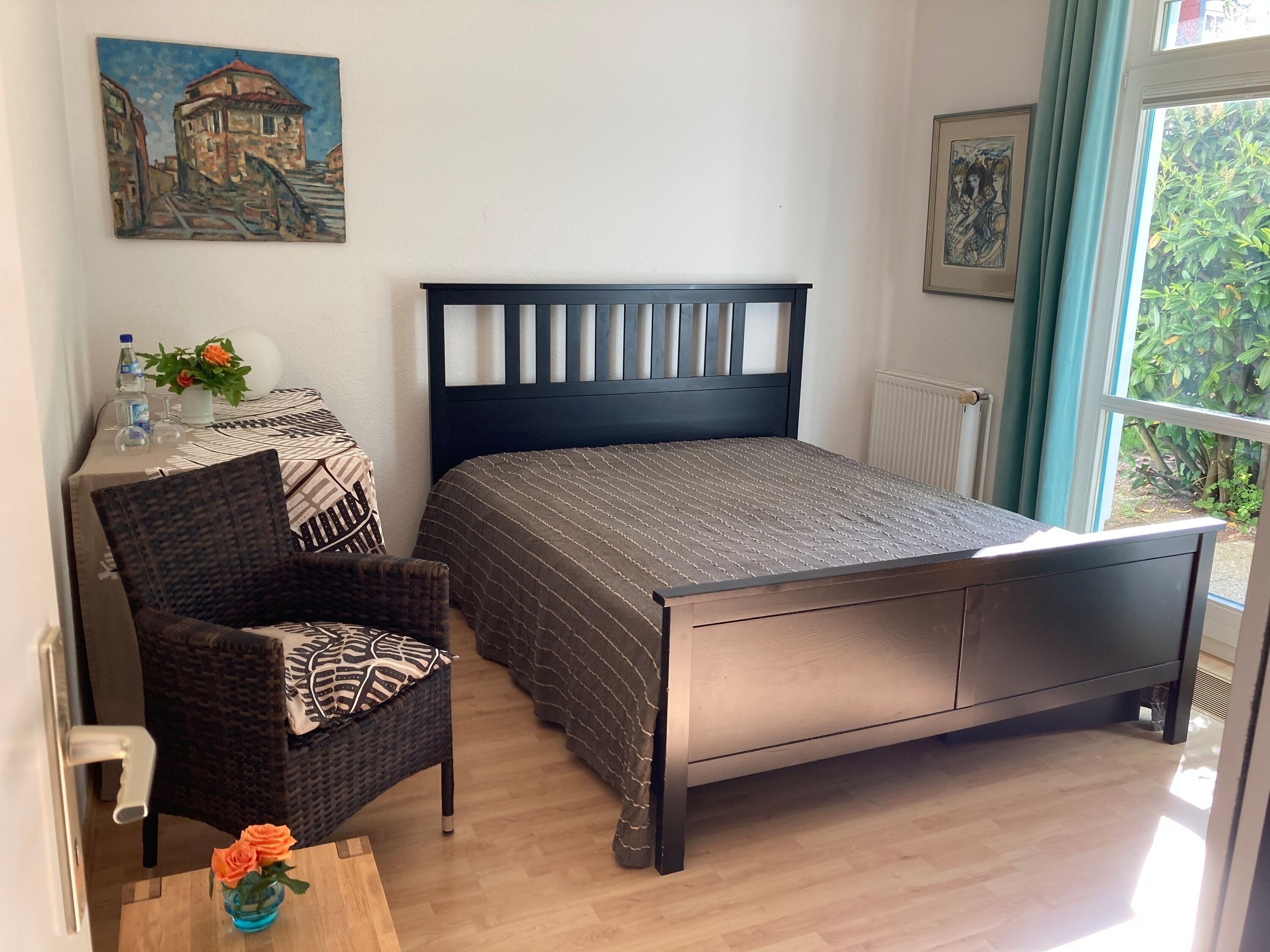 Das Wohnambiente ist modern und individuell gestaltet. Die Wohnung verfügt über eine große separate Küche mit Blick auf den Garten.