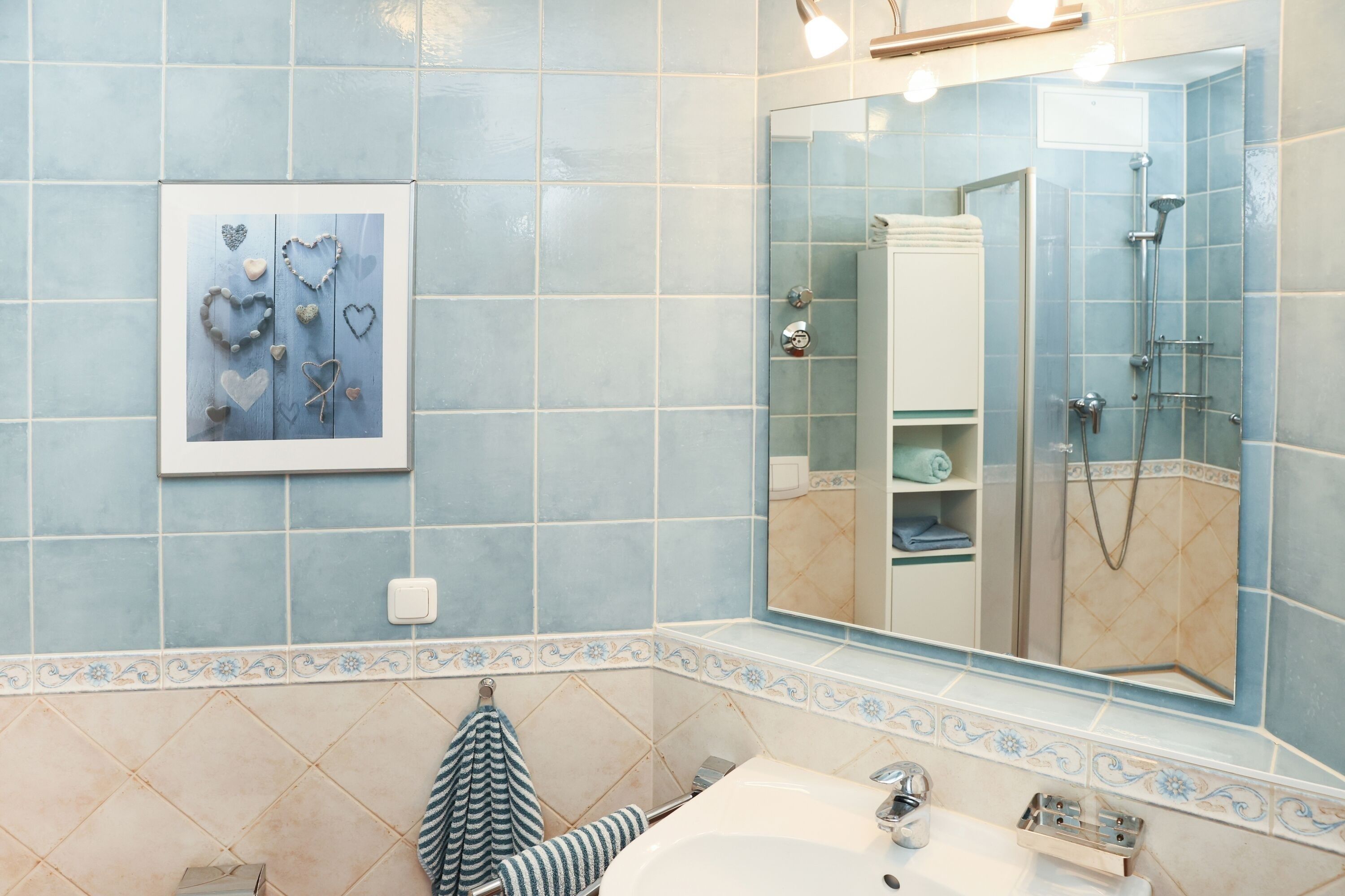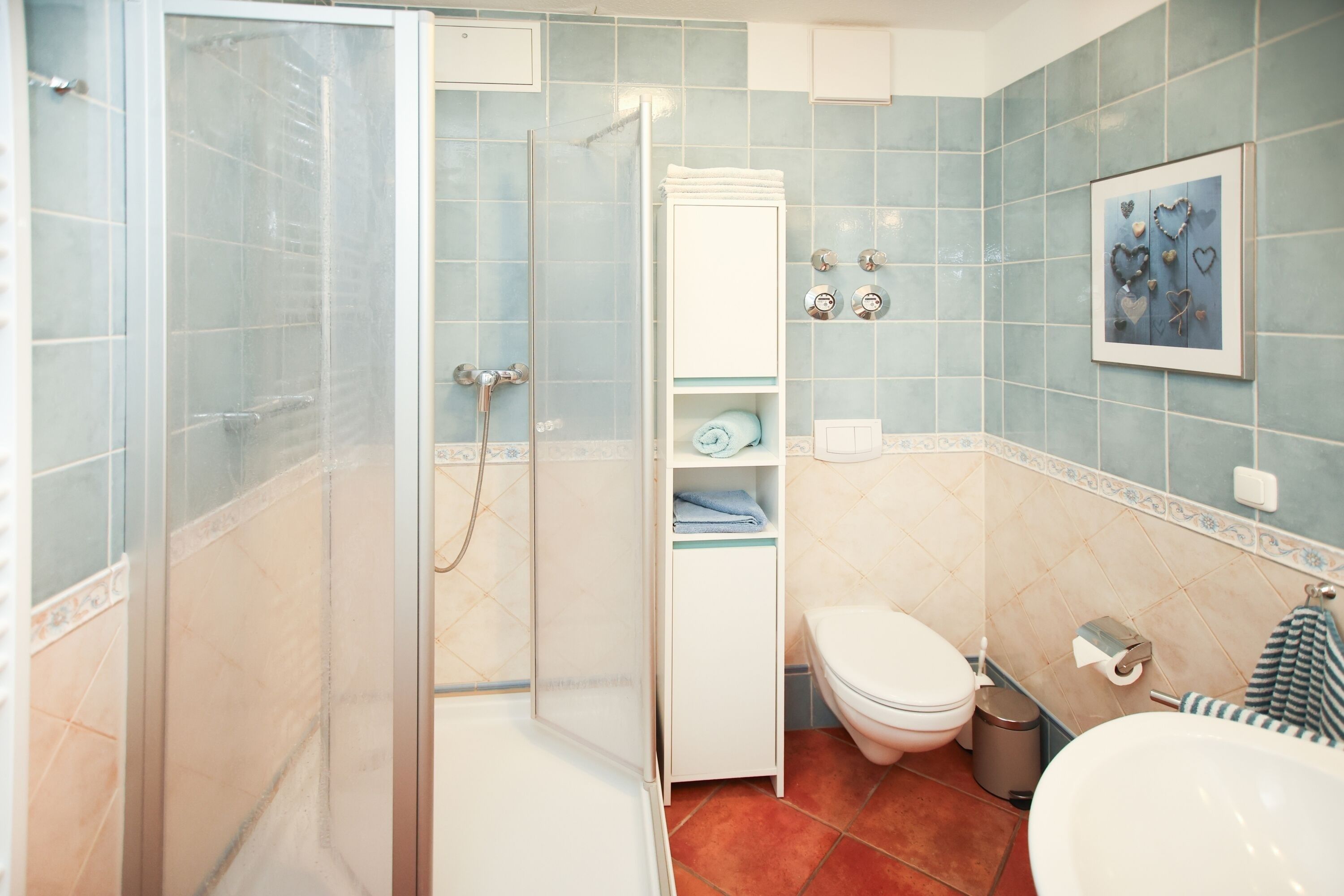 Der Wohnbereich ist gefliest, im Schlafzimmer ist Laminat verlegt. Ein Duschbad/WC ergänzt die Ferienwohnung.