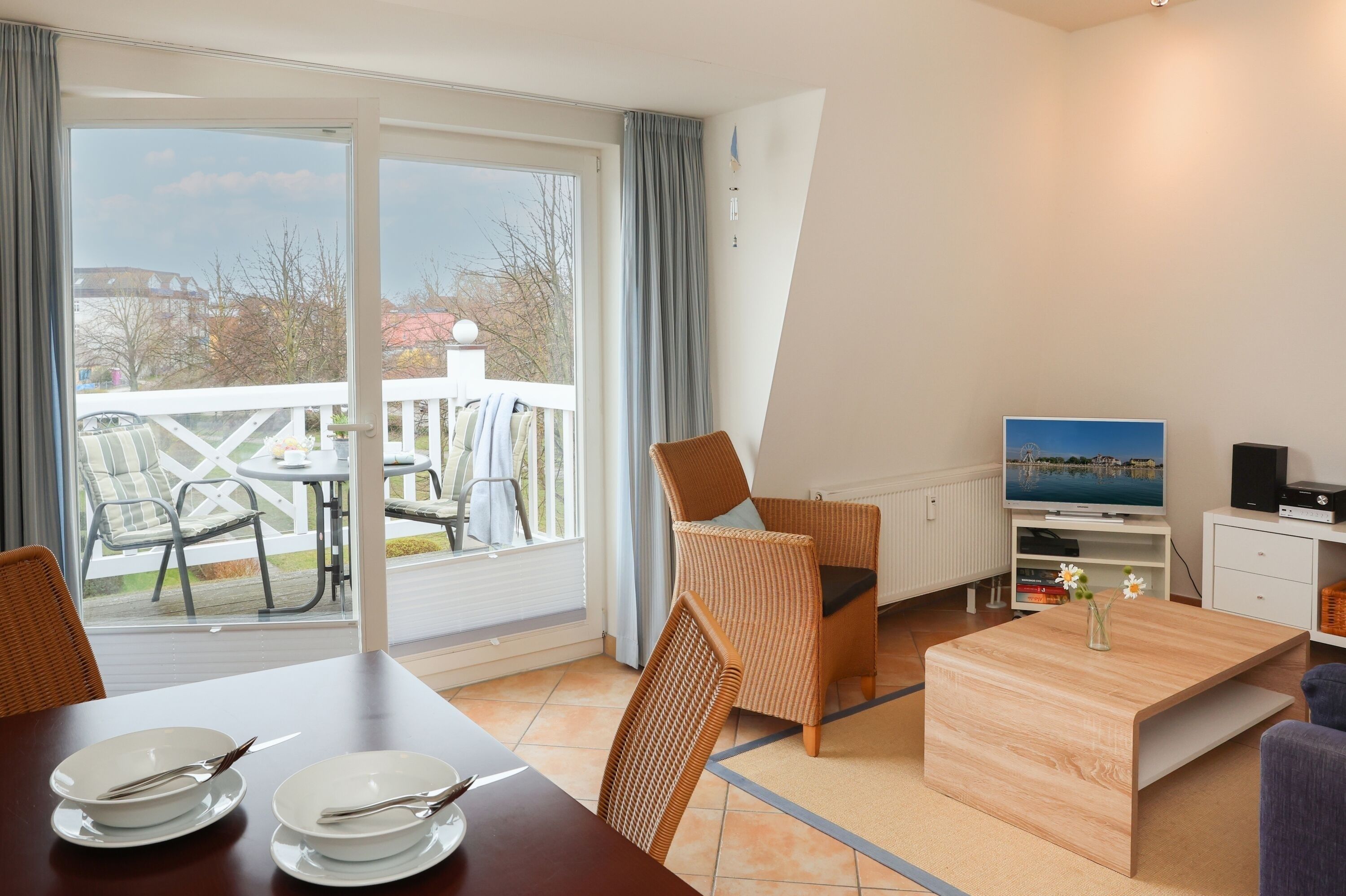 Der Wohnbereich bietet eine Sitzgruppe mit Doppelschlafcouch, Farb-TV, DVD-Player, Radio sowie W-LAN.