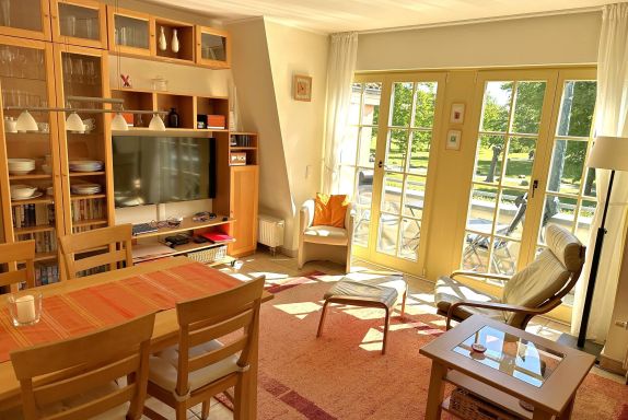 Im Wohnbereich befindet sich eine Sitzgruppe mit Couch und Sesseln, Hifi-Anlage und mit LCD-TV sowie ein Esstisch.