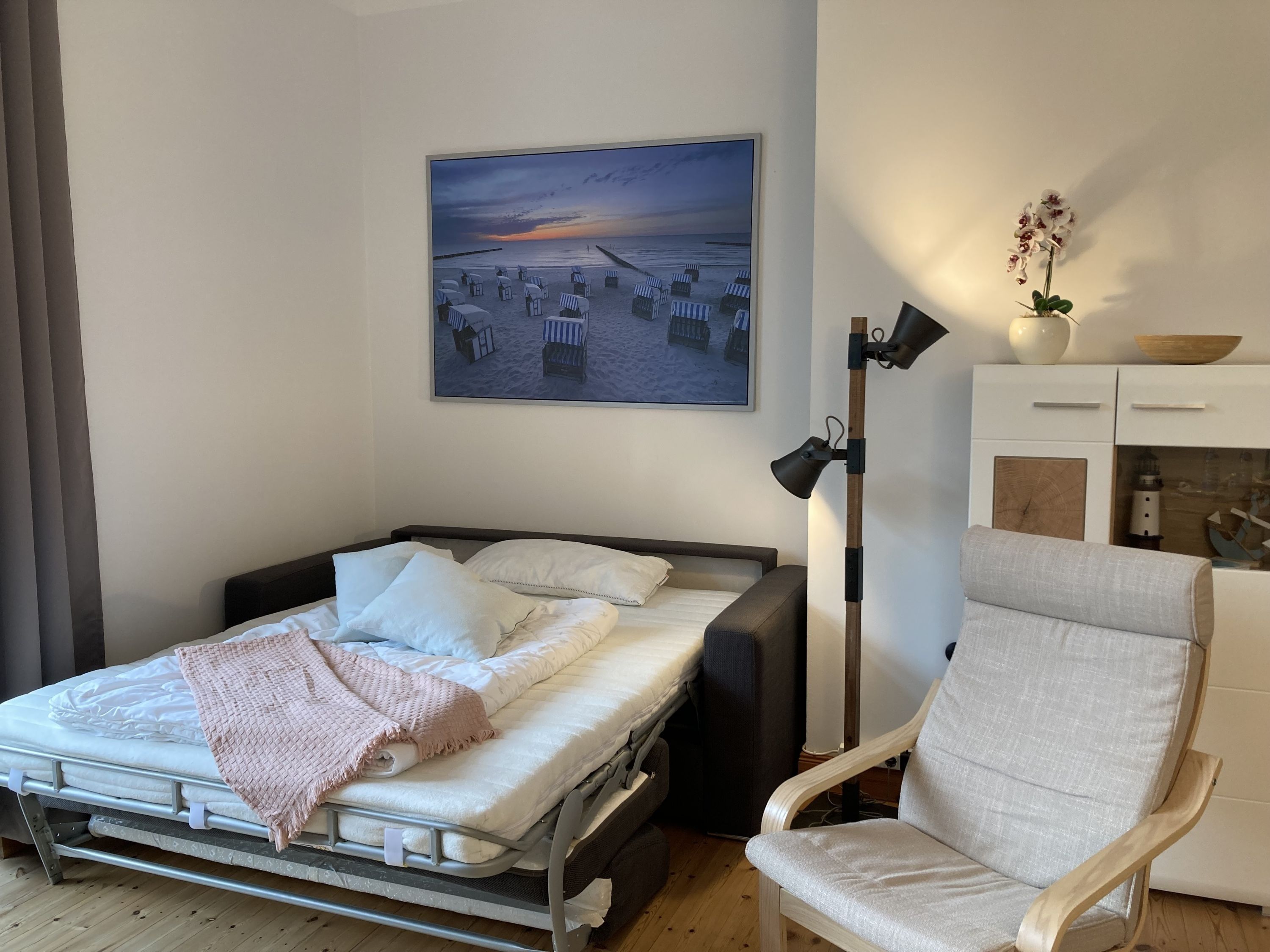 Herzlich willkommen in unserer 2-Zimmer Ferienwohnung in der Villa „Glück auf“, einer 1906 erbauten und in 2001 sanierten, denkmal geschützten Bäderstilvilla mit hohen Decken.