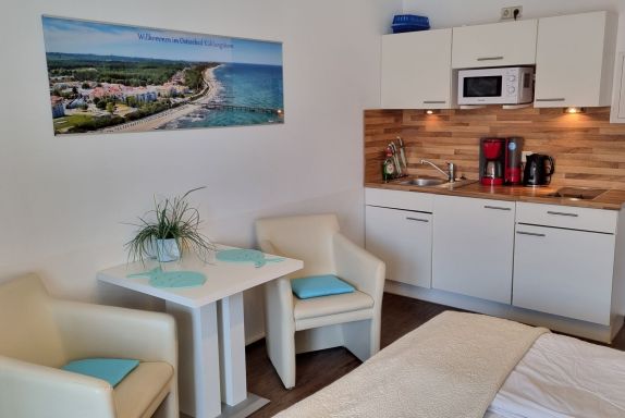 Die Wohnung verfügt über eine voll ausgestattete Küchenzeile mit Geschirrspüler, einem Nord-Balkon und W-LAN.