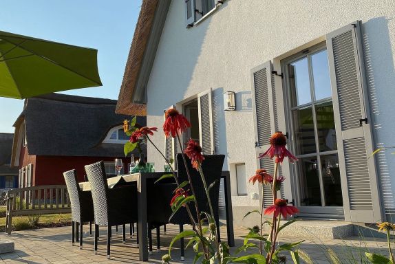 Die Südterrasse ist mit Gartenmöbeln bestückt und der große Garten mit Sonnenliegen und hauseigenem Strandkorb lädt zum Entspannen und Spielen ein. Ein vorhandener Elektrogrill kann genutzt werden.